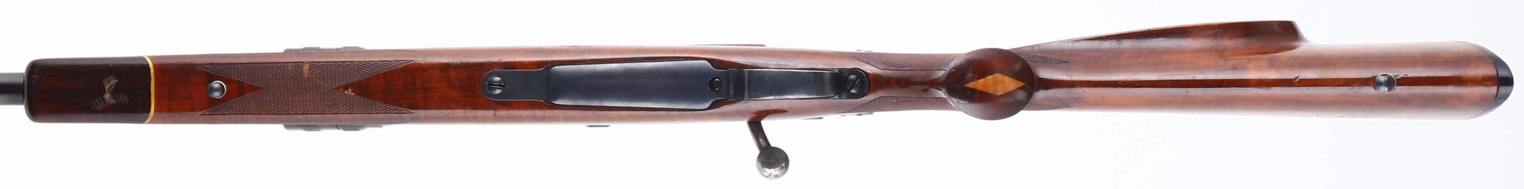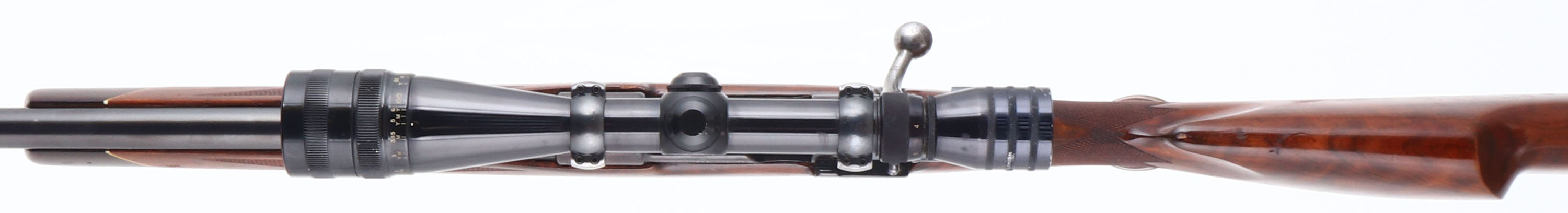 Custom Rifle, Mauser, K98K Action, CAL: 30-06, MFG: N/A, SN: 20132, Bolt Action Rifle, 26 1/2'' barrel. The checkered, cheeked & flat pistol grip Monte Carlo wood stock, with redwood forend tip & pistol grip cap, is excellent. There are contusions, scrapes & dings to the applied high gloss finish, which shows some crinkling or spiderwebbing. The metal blue finish on the barrel rates 95%. The 90% receiver finish has toned plum. Bore is excellent. The receiver holds a Redfield 4-12x scope. No open sight provisions. Sling studs. Checkered plastic buttplate. A customized hunting rifle built on a Mauser 98 action. FFL or C&R Req. - Value: 400 to 800