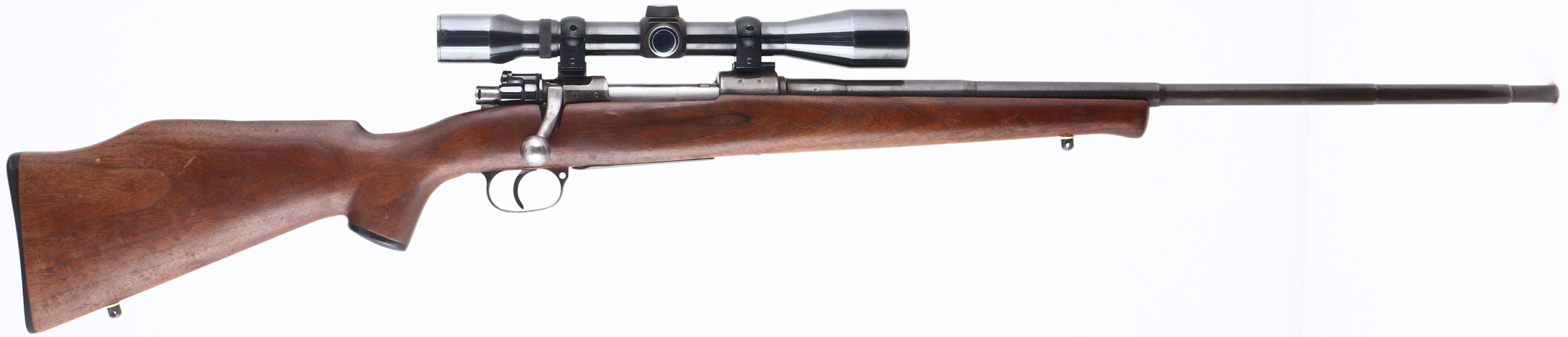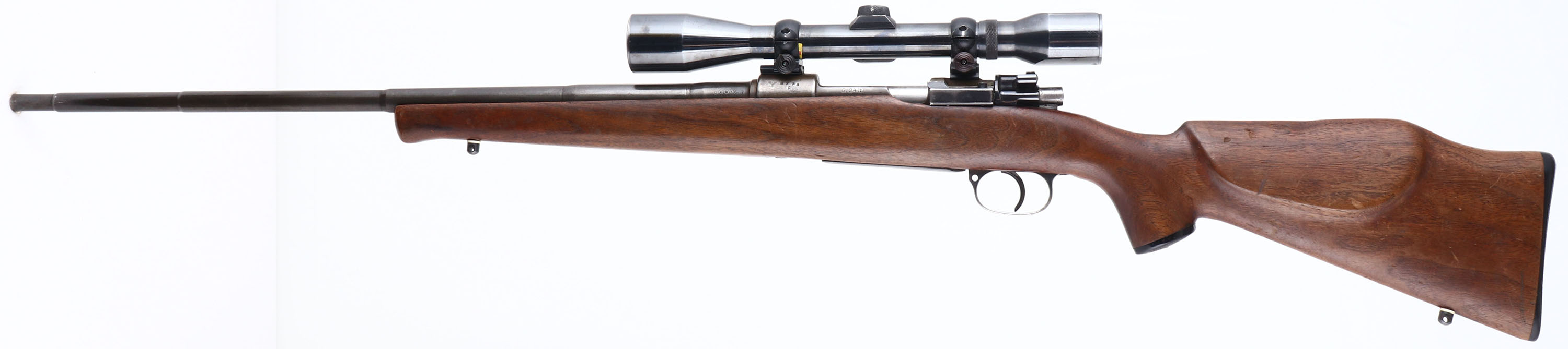 Waffenfabrik Brunn (Czech), Model: G.24 (T), Cal: 7x57mm, MFG: 1938-42, S/N: 5775, Bolt action rifle, 24'' Barrel. The capped pistol grip & cheeked monte Carlo sporting stock is very good with light scratches, small dings & wear from use. There is a small edge chip at the toe. The receiver has worn gun metal gray, with brown patina. The metal finish on the barrel has thinned & toned gray, with 50% coverage. Left side of receiver is marked with iron eagle proof mark, S/N, ''FOX'', ''G.24(T)''. The right side of receiver is marked with additional proof marks. The left side of barrel is marked, ''0'', X'd out number, X'd out number, ''7X57''. The top of barrel is marked ''89''. The right side of barrel is marked with proof marks. Bore is very good. Mounted with an unmarked scope, which appears to be a Redfield. Stock carries a BISHOP plastic checkered buttplate. Sling studs. FFL or C&R Req. - Value: 200 to 400