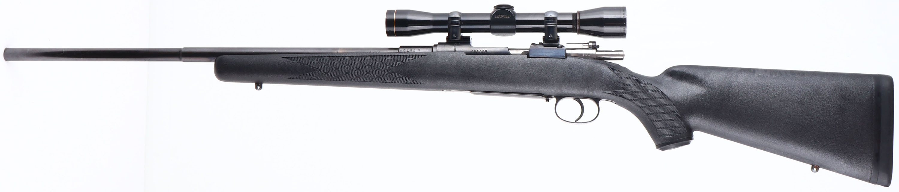 Custom Rifle, Husqvarna, Model M38 Swedish Mauser Action, CAL: 6.6x55, MFG: 1941, SN: 601630, Bolt Action Rifle, 23'' step-down barrel. The RAM-Line checkered & capped synthetic stock is excellent. The metal blue finish on barrel rates 80%, with scuffs, scrapes & areas of wear & thinning. Finish on receiver & floorplate rate 90%. Bore is excellent. The receiver holds a Leupold M8-4X scope. No open sight provisions. Solid black recoil pad. Sling studs. A Nicely built custom hunting rifle. FFL or C&R Req. - Value: 300 to 600