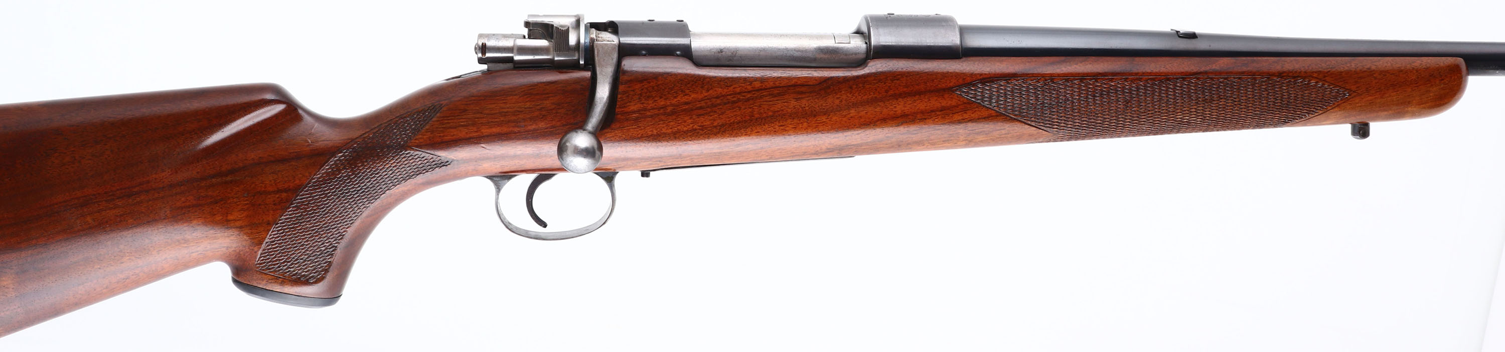 Husqvarna, Hi-Power Sporting Mauser, CAL: 220 Swift, MFG: 1946-51, SN: 126648, Bolt Action Rifle, 24'' barrel. The checkered, cheeked & capped pistol grip wood stock is excellent. There are very few handling marks to the excellent finish. The metal blue finish on the barrel rates 90%, with spotty areas of finish loss. The metal blue finish on the receiver rates 80%, toning a bit plum & with areas worn to metal grey. Finish on the floorplate & trigger guard has worn & tone to 30% of a thin brown patina. Bore is excellent. The receiver is tapped & drilled for scope mounts, with (4) screw filled holes. The barrel has a blank filled rear dovetail. Stock carries sling studs & a J.C Higgins plastic buttplate. An excellent looking small caliber varmint rifle. FFL or C&R Req. - Value: 400 to 800