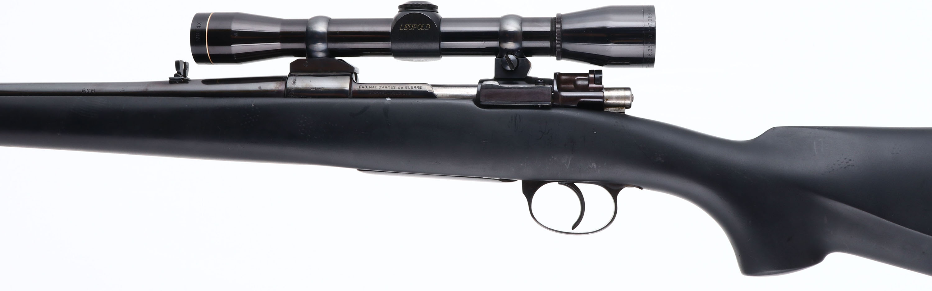 Custom Rifle, Fabrique Nationale d'Armes De Guerre, Columbian Military Mauser action, CAL: 6mm, MFG: N/A, SN: 14834, Bolt Action Rifle, 21'' barrel. The flat pistol grip & raised cheek synthetic stock is excellent, but with several handling marks, scrapes & scuffs. The metal blue finish rates 90%, toning a bit plum & with some spotty areas of wear. Bore is excellent. The receiver carries a Leupold M8-4x scope, while the barrel holds a single leaf flip-up rear sight & ramp elevated blade front sight. Ventilated recoil pad. Sling studs present. A very nice custom built hunting rifle. FFL or C&R Req. - Value: 400 to 800