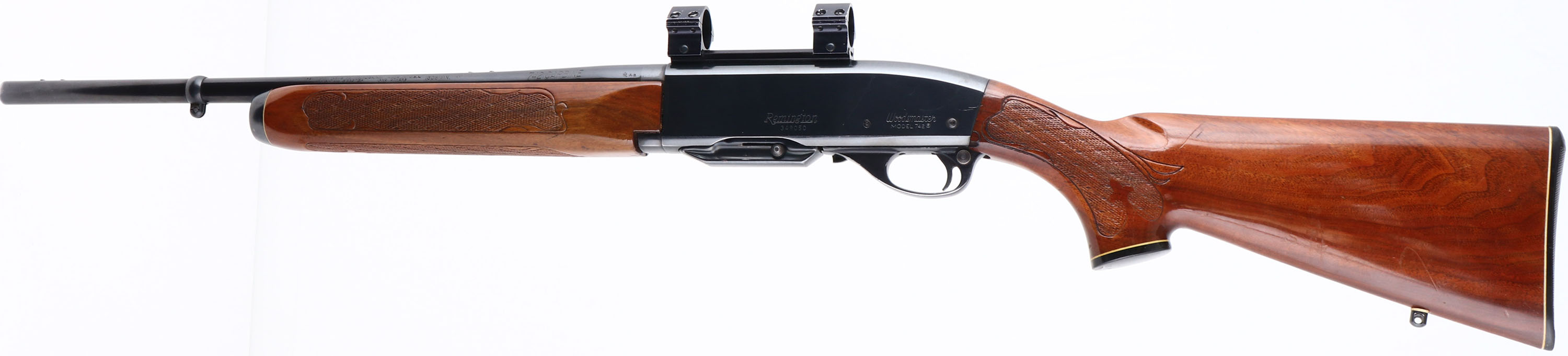 Remington Model 742 Woodsmaster Carbine, CAL 308 Win, MFG: 1968, SN: 349050, Semi-Auto Pump Action Rifle, 18 1/2'' barrel. The high gloss, checkered, capped pistol grip wood stocks are excellent. There is some spotty areas of rub & use wear to the finish. Some finish flaking on the pistol cap. The metal blue finish rates 95%. Bore is excellent. The receiver carries a scope mount & rings, while the barrel holds the screw filled holes from removal of the original sights. Buttstock carries a Remington marked, checkered black plastic buttplate. Removable mag. Sling studs. A very nice example of a newer 742. FFL or C&R Req. - Value: 400 to 800
