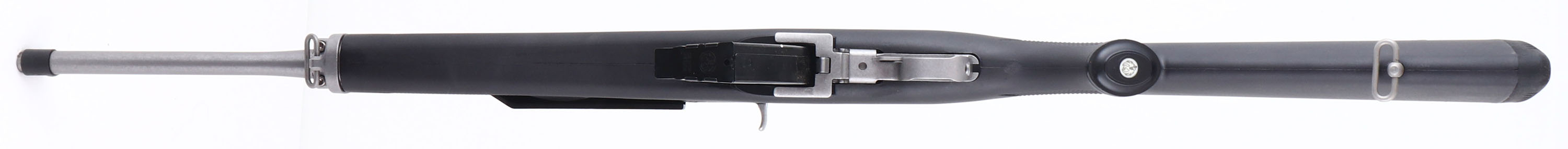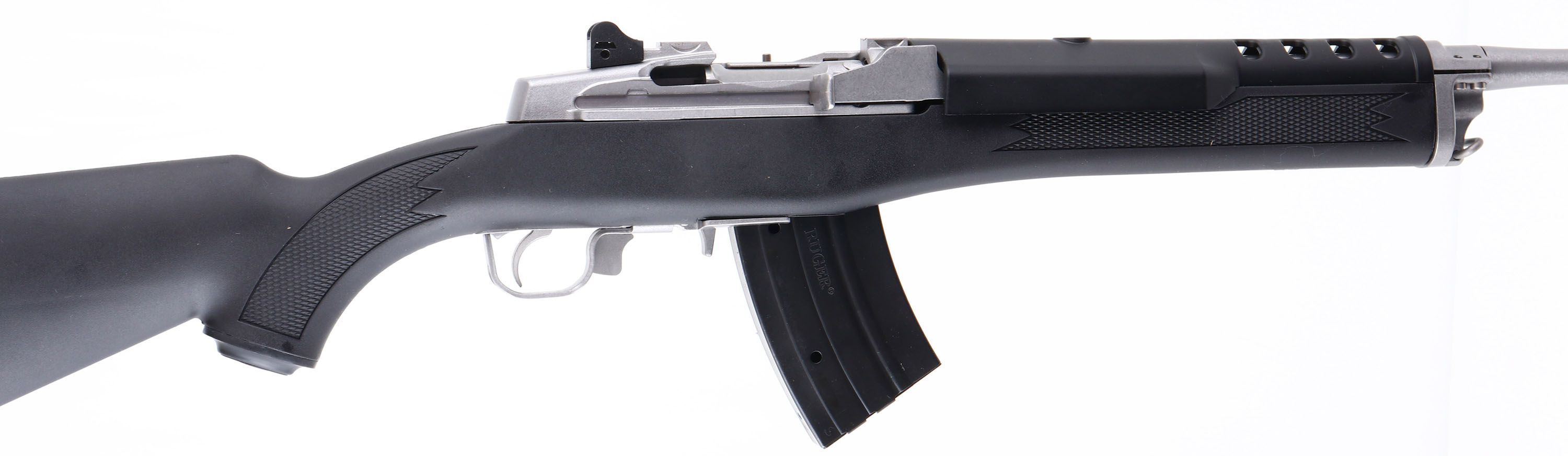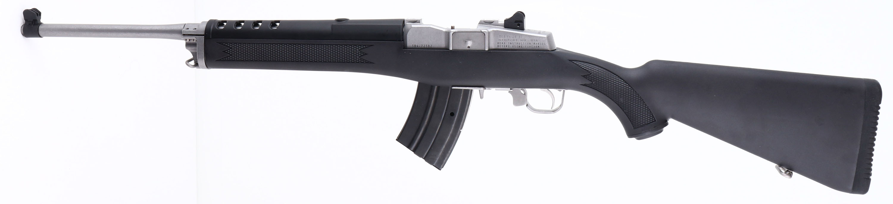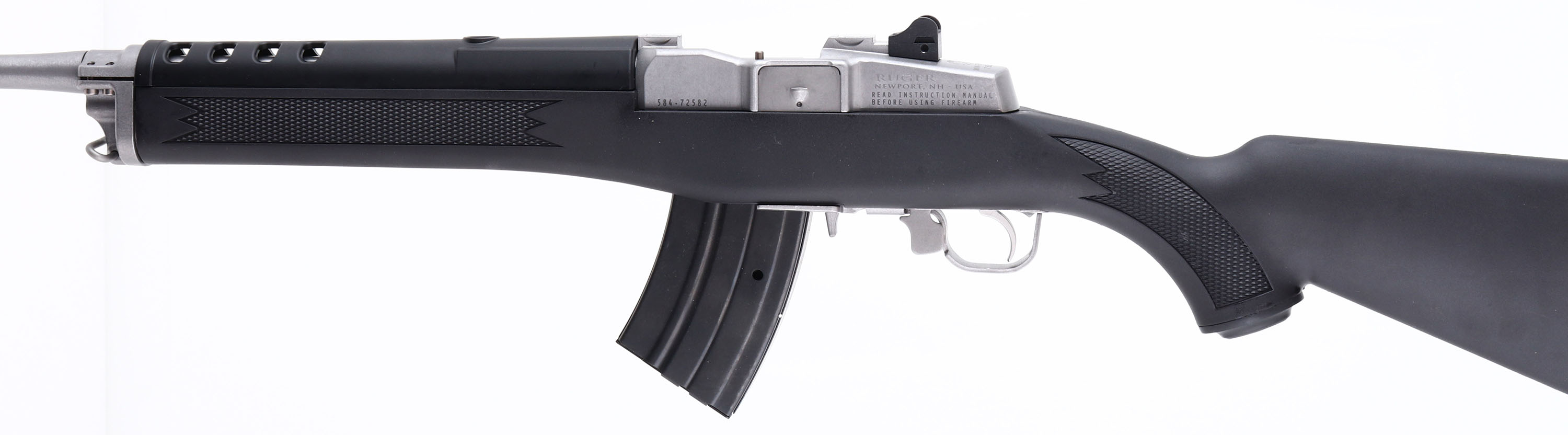 NEW, BOXED, Ruger, Mini-30, CAL: 7.62x39, MFG: Modern, SN: 584-72582, Semi Auto Rifle, 18 1/2'' barrel. The checkered & capped synthetic stock, with heat shield is excellent. The matte stainless steel finish on the barrel & receiver is excellent. Bore is excellent, unfired outside factory test. The receiver holds an adjustable rear peep sight & the barrel holds a banded winged blade front sight. The receiver is also tapped & drilled for mounting the included picatinny rail & scope rings. Stock carries a grooved hard rubber kickpad. Comes in factory box, with owners manual, (2) mags, scope rings, picatinny rail & lock. NOS. FFL Req. - Value: 800 to 1400