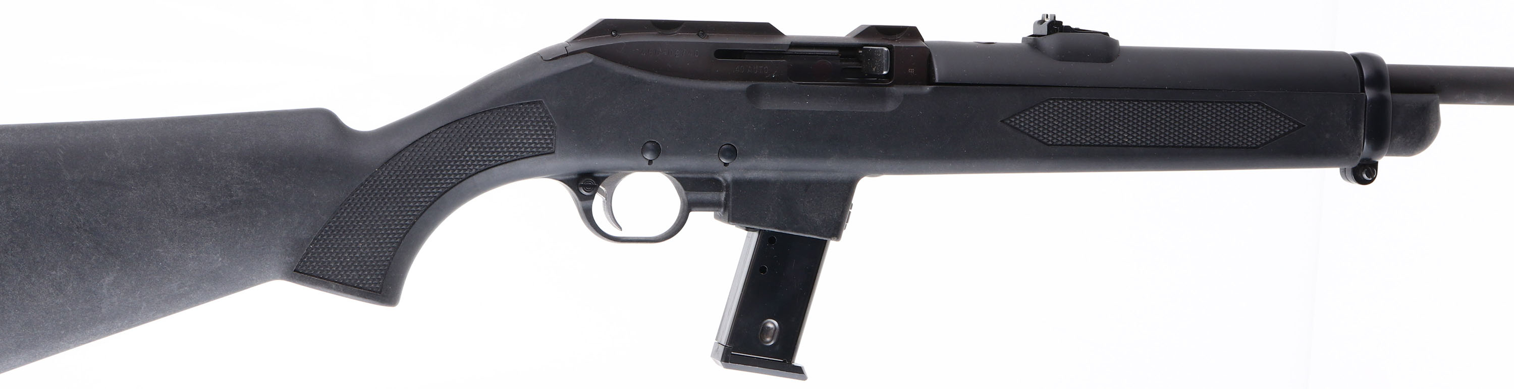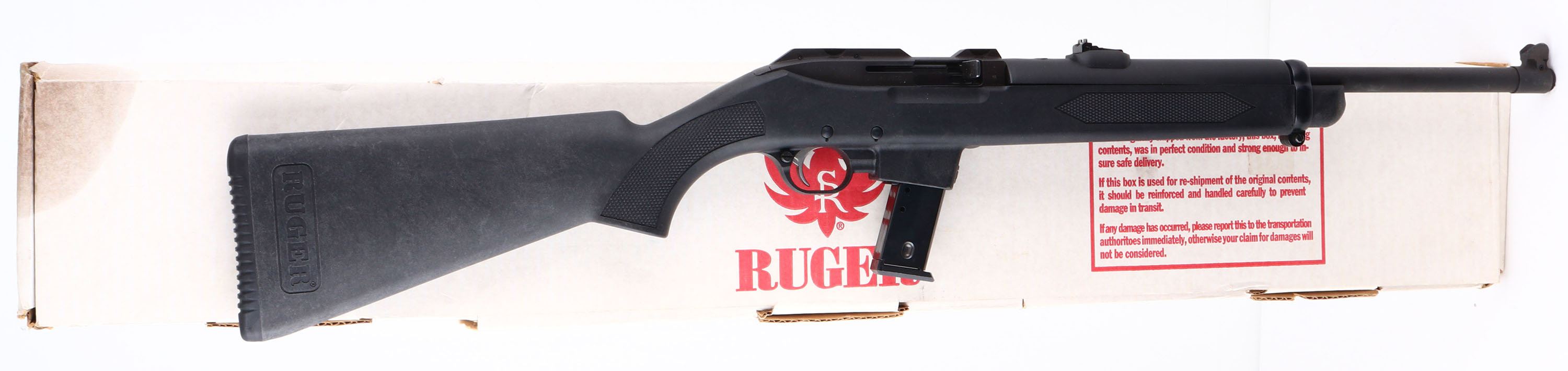 BOXED Ruger, Model PC4 Carbine Rifle, CAL: .40 AUTO (40 S&W), MFG: Modern, SN: 480-02740, Semi-Auto Rifle, 16'' Round barrel. The factory, checkered, pistol grip synthetic stock is excellent. The factory metal finishes are excellent. Factory rubber buttpad. Two Ruger marked detachable mags. Bore is excellent. Receiver carries a factory adjustable folding ghost ring aperture rear sight & a non-glare, protected blade front sight. Basically a NIB & NOS carbine. FFL Req. - Value: 500 to 900