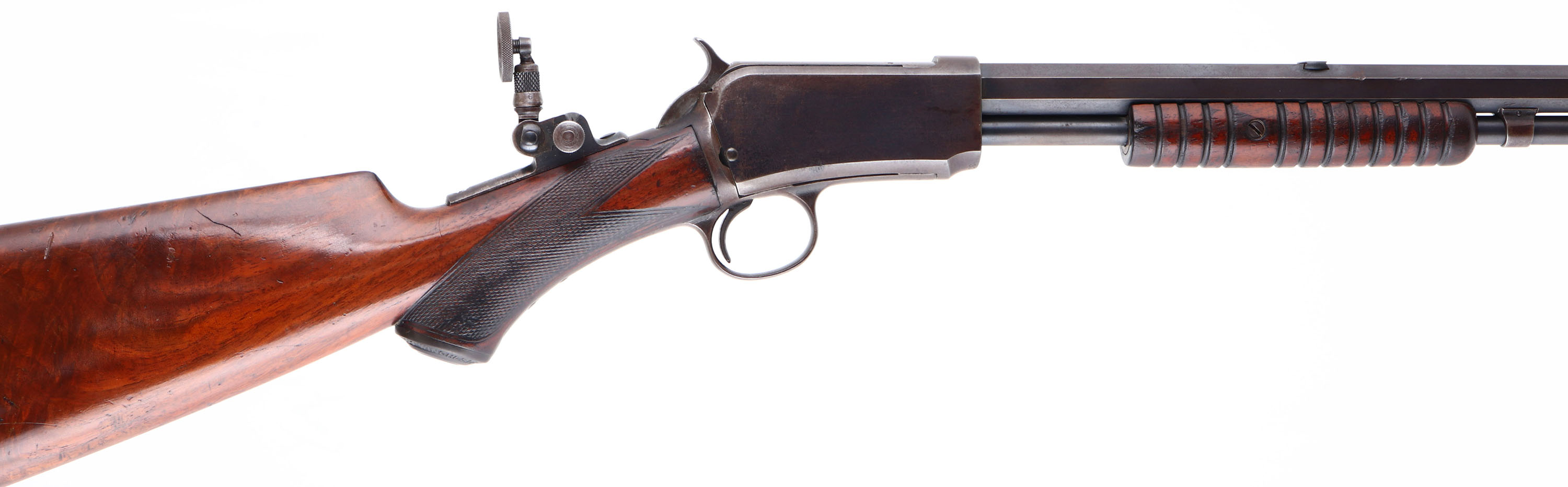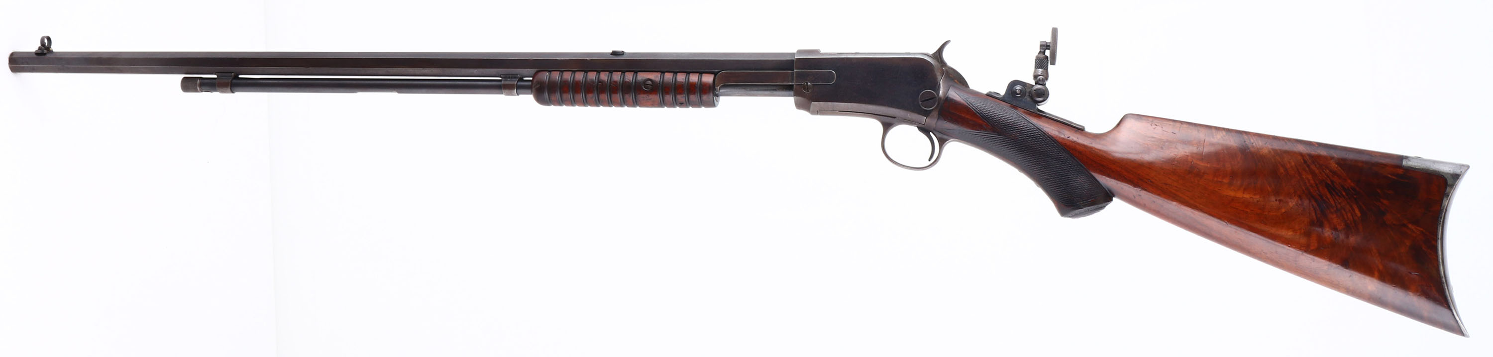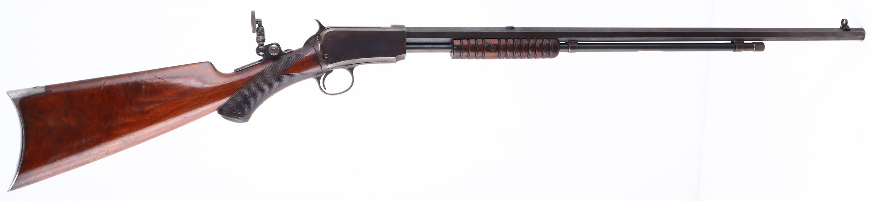 RARE DELUXE Winchester, Model 1890 2nd variation, .22 WRF Cal., MFG. 1907, SN: 330944, Pump Action Rifle, 24'' Octagonal barrel. The original, deluxe checkered & capped pistol grip wood stocks are excellent, with wonderful scalloped & feathered grain. The original finish is very good, thinning & flaking at the carry points. The checkering has rounded point from use & there are minor scuffs, scratches & contusions. The original blue finish is toning to a brown patina as it thins, with coverage on the receiver at 70%, 80% on barrel & mag, with brighter blue remnants in the protected areas around the sights. Barrel has a few nicks or edge abrasions. The rifle is fitted with a Lyman 103 windage tang sight, with large aperture disk. Barrel carries a Marbles blank filled rear dovetail & a Lyman No. 5B combination globe sight, with white bead. The bore is very good, but with spots of roughness amongst strong rifling. Crescent metal buttplate. Tight smooth action. A fantastic deluxe rifle in original & highly collectible condition.* FFL or C&R Req. - Value: 3000 to 6000