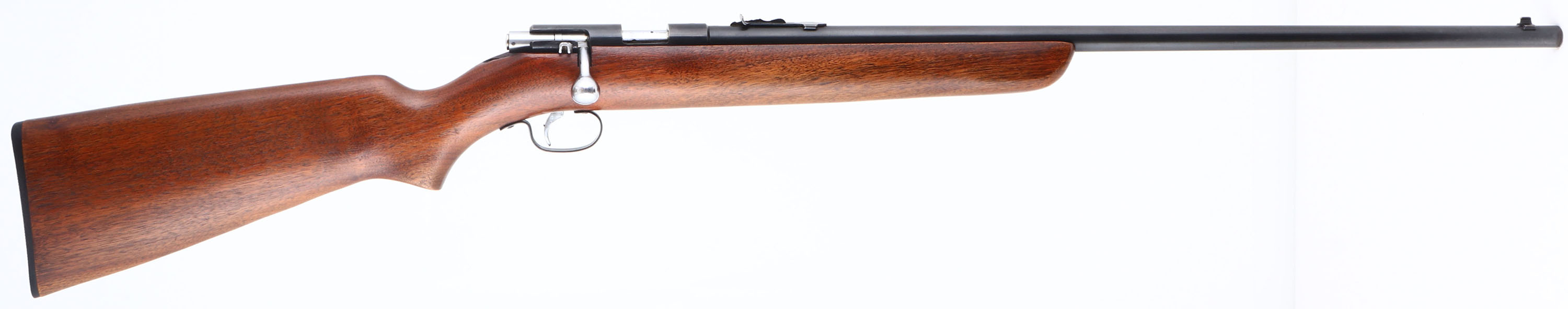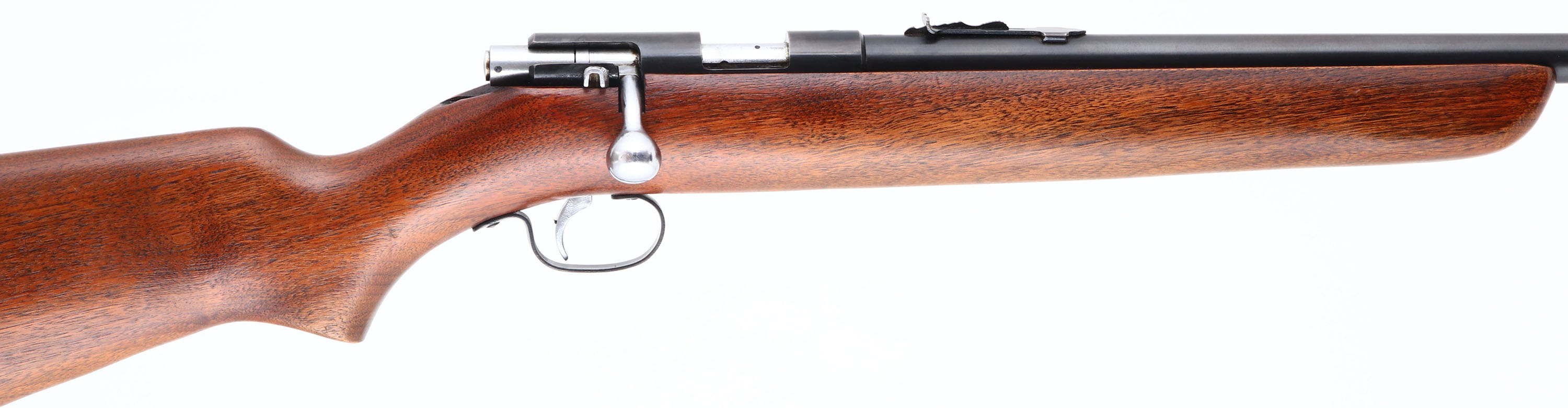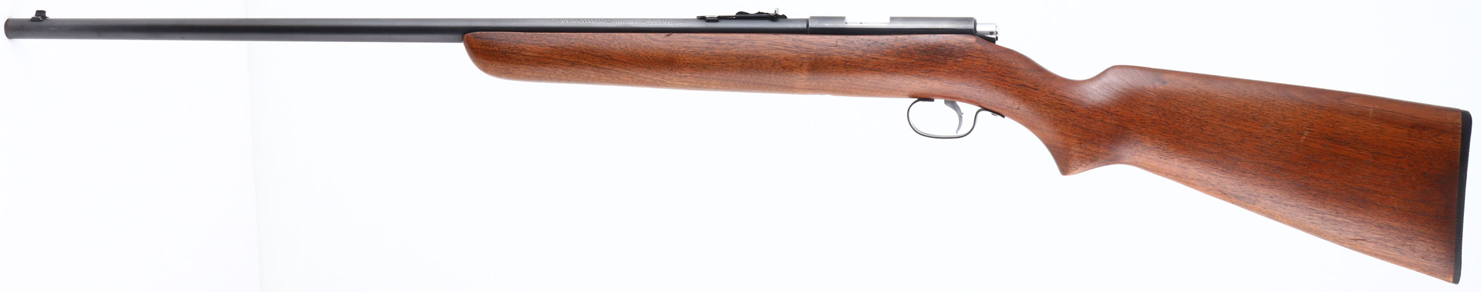 RARE Winchester, Model 47, .22 S. L. LR. Cal., MFG. 1948-54 SN: NSN, Bolt Action Rifle, 25'' barrel, The original flat pistol grip wood stock is excellent & solid, with the slanted back forend tip. There are very few tiny contusions & scuffs to the original finish. The factory metal blue finish on barrel & trigger guard remains at 95%, with loss due to a couple areas of depth thinning rather than coverage loss. Nickel tone bolt handle, bolt & trigger. The bore is excellent. Mounted with adjustable rear sight & standard front sight. Winchester plastic buttplate. Low production model at approx. 43,000 mfg. These are fairly rare rifles & especially when in this high original condition. FFL or C&R Req. - Value: 500 to 1000