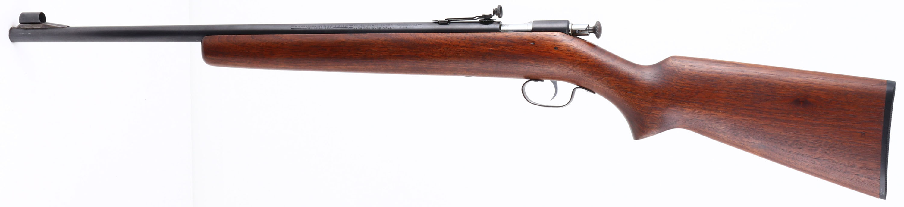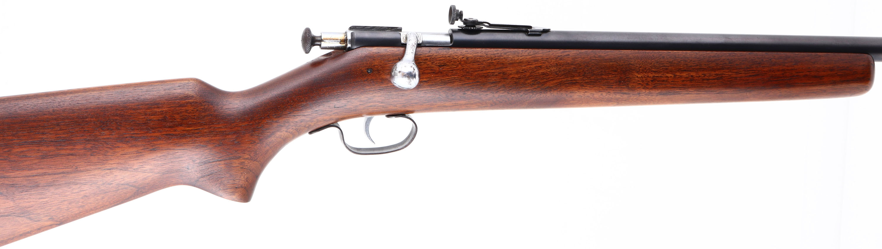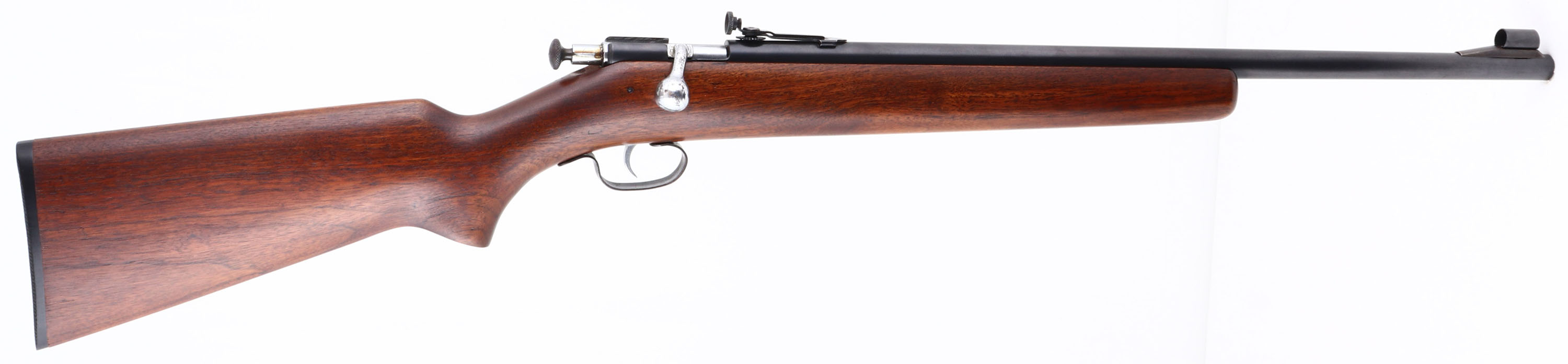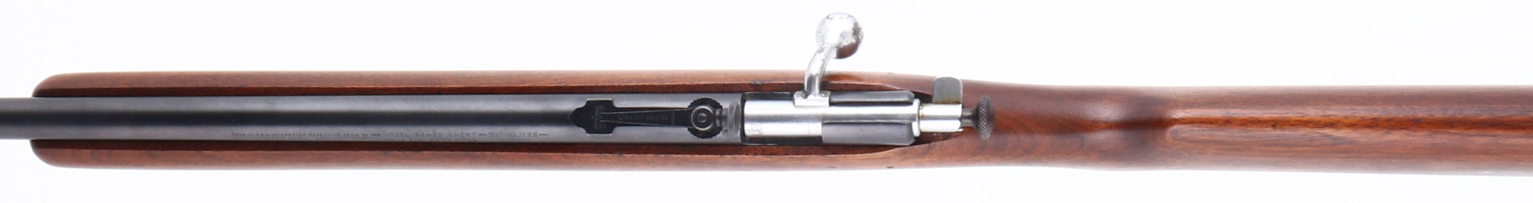 ARE!! Winchester, Model 68, 2nd Issue ''Junior Variation'', CAL: .22 S.L.LR, MFG: 1943, SN: NSN, Bolt Action Single Shot Rifle, 20'' barrel, Crowned Muzzle. Standard Model 68 rifles carried 27'' barrels, but in 1943 Winchester assembled some rifles with 20'' barrel giving it the ''Junior'' designation. The buttstock was also 1'' shorter on these rare Junior models. Although these special youth models were never advertised, or promoted, a limited number were produced making examples very desirable. This rifle has been professionally restored to factory standards. The factory flat pistol grip wood stock is excellent & solid, with very few minor handling marks. The metal blue finish rates 98% on barrel & thinning to 80% on trigger guard. Bore is excellent. The barrel holds the rare disc adjustable peep sight & a ramp elevated hooded front sight. Stock carries a Winchester checkered black plastic buttplate. A high condition example of a rare & very collectible .22 rifle. FFL or C&R Req. - Value: 800 to 1500
