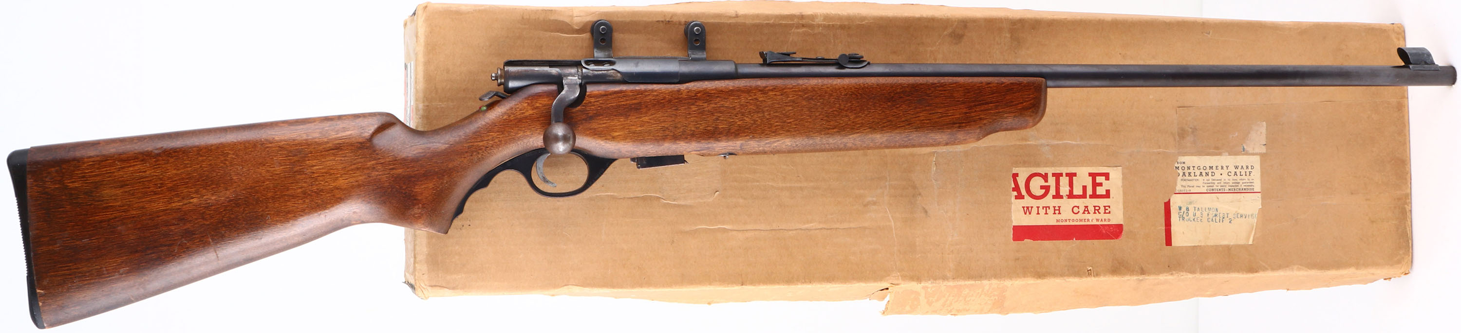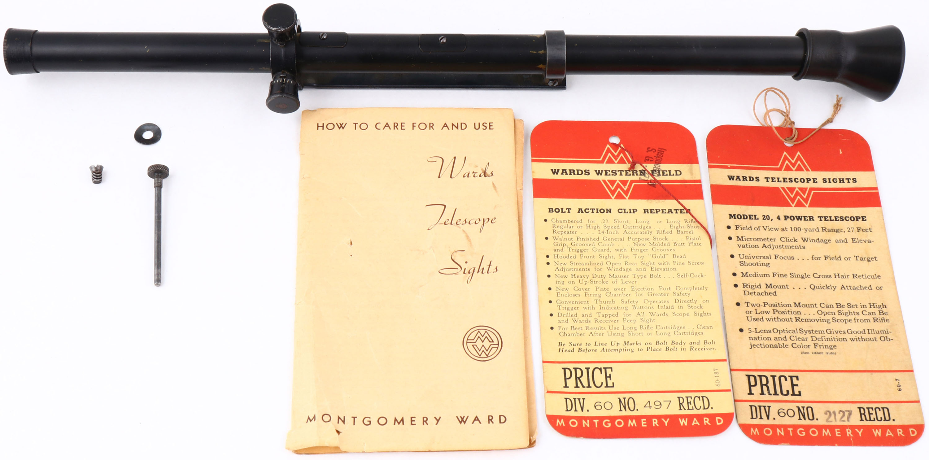 BOXED, Ward's Western Field, Model 04M 497A, CAL: 22 S.L.LR, MFG: Late 1930's, Early 1940's, SN: NSN, Bolt Action Rifle, 24'' barrel. The original flat pistol grip wood stock is excellent. There are minor scrapes, dings & small areas of thinning or flaking to the original finish. The metal blue finish rates 95% overall, beginning to tone to a brown patina. Bore is excellent. The receiver holds a side-mounted scope base. Included is a factory scope, held by a Wards Model 20 base, but the scope does not appear to attach to the gun with the current hardware. The barrel holds a disc adjustable rear sight & hooded cone front sight. Grooved plastic buttplate. Comes in original box, with owners manual & other paper articles. FFL or C&R Req. - Value: 200 to 300