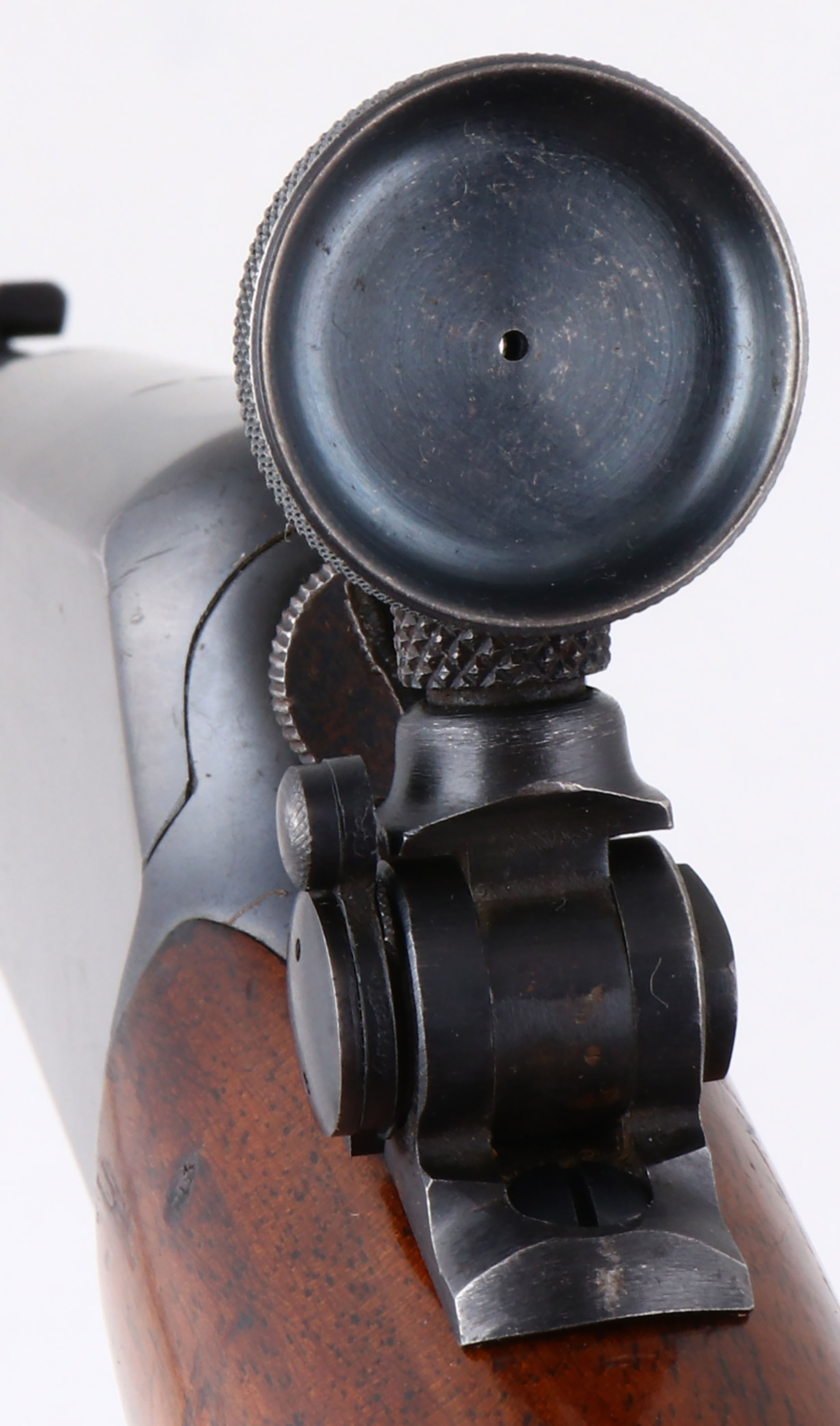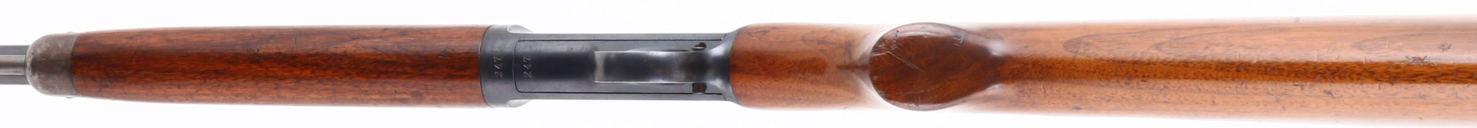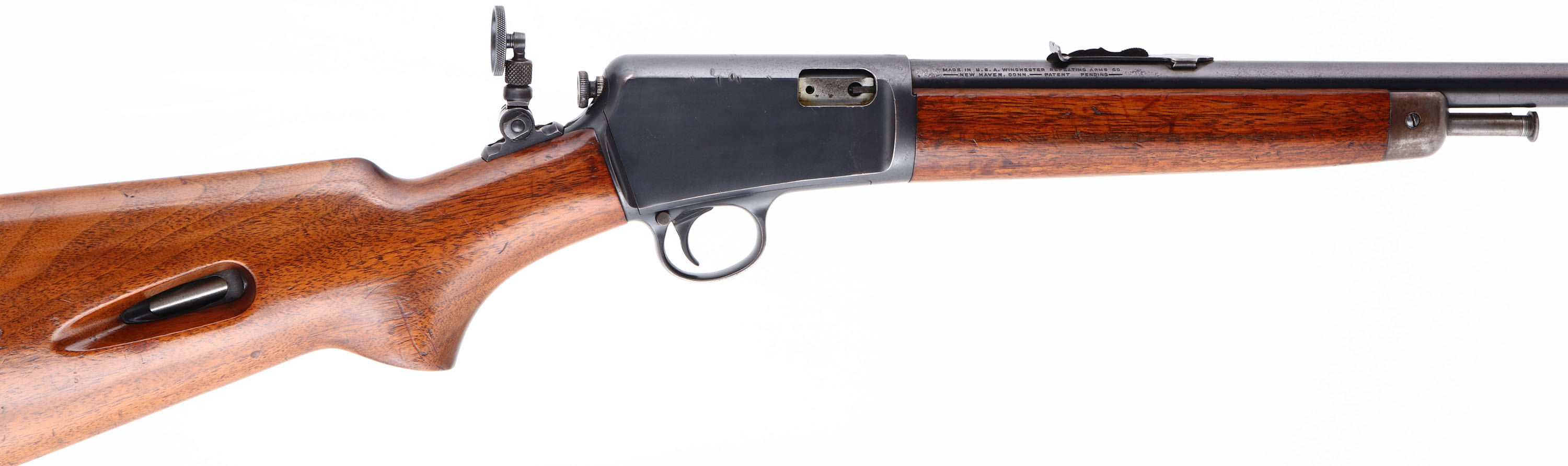 Winchester, Model 63 Carbine, .22 LONG R. SUPER SPEED & SUPER-X Cal., MFG: 1933, SN: 247, Semi-Auto Action Rifle, Likely a first week or first month production gun. Has the rarer early 20'' carbine length tapered round barrel. The 20'' barrels were discontinued in 1936 when the 23'' barrel length was implemented. The original factory flat pistol grip wood stocks are excellent & solid, despite numerous small blemishes, contusions, scratches & chips along the edge of the pistol grip & buttend. The stocks retain the majority of the original finish. The original metal blue finish is 95% on the barrel, 85% on the receiver, with areas of thinning loss toning a bit plum. Bore is excellent. Fitted with a large disk aperture tang sight, while barrel carries an adjustable rear & small blade front sight. Factory metal buttplate. A very nice & original early production semi-auto. FFL or C&R Req. - Value: 1200 to 2500