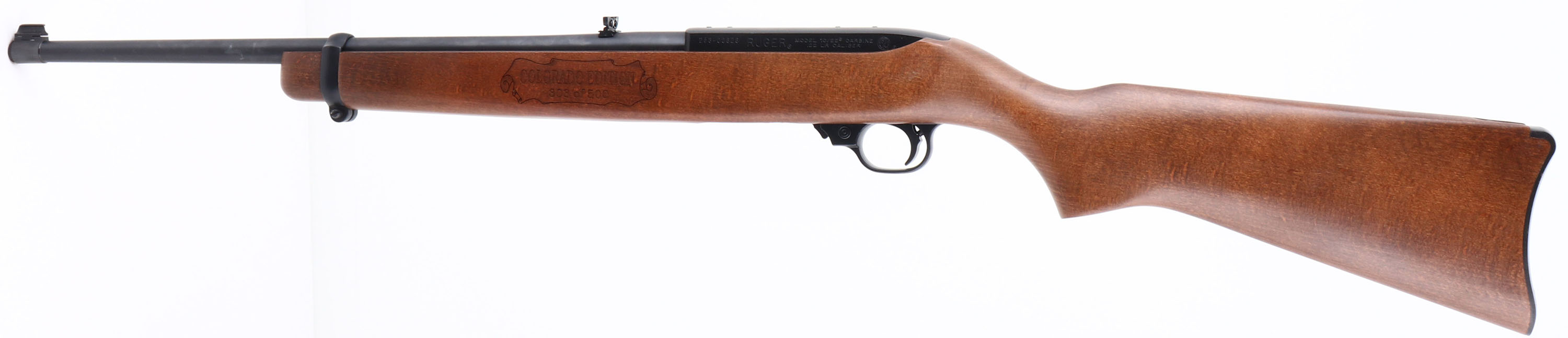 Ruger, Model 10/22 Carbine, Sept 11th Colorado Edition 303 of 500, CAL: 22 LR, MFG: 2001, SN: 253-00626, Semi-Auto Rifle, 18 1/2'' barrel. The original flat pistol grip wood stock is excellent, with excellent original finish. The stock carries laser engravings, with a New York State coin. The metal blue finish rates 99%. Bore is excellent, with defined rifling. The rifle is fitted with a folding leaf rear sight & elevated blade front sight. Buttstock carries a carbine style plastic buttplate. Missing detachable mag. FFL Req. - Value: 300 to 600
