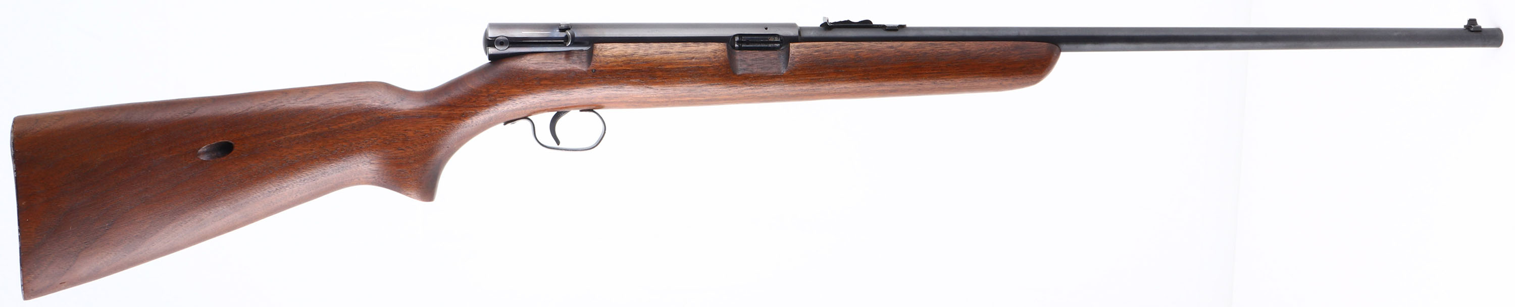 Winchester, Model 74, Marked .22 LONG RIFLE, MFG. 1948, SN: 185843A, Semi-Auto Rifle, 22'' Tapered round barrel, Although some 400,000 plus model 74 rifles were produced, it is a rifle that is seldom encountered & little is know. Cartridges load through the buttstock once the mag follower is removed through the buttplate. High condition factory original examples such as this rifle do command a premium among collectors. The original American straight grain walnut & pistol grip stock is excellent & carries the factory finish. There are very few finish level contusions or scuffs. Factory metal blue finish is 95% overall. Bore is excellent. Fitted with an adjustable rear sight & factory front sight. The unusual receiver mounted safety functions by sliding it side to side within a dovetail channel. An excellent & original condition, Winchester semi-auto .22. FFL or C&R Req - Value: 500 to 1000