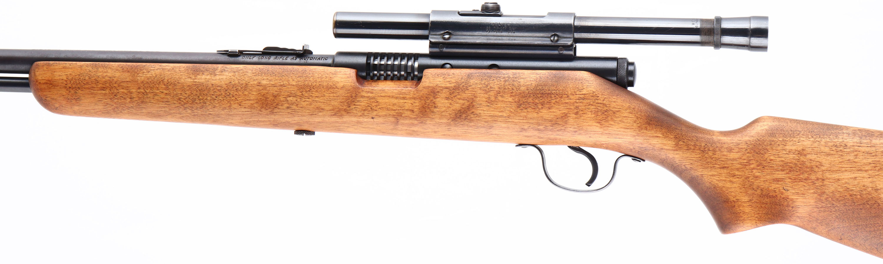 Stevens (Savage), Model 87C, CAL: 22 S.L.LR, MFG: 1953, SN: NSN, Semi Auto Rifle, 24'' barrel. The original, flat pistol grip wood stock is excellent, having been lightly sanded & nicely refinished. The metal blue finish on the barrel & receiver rates 85%, mostly toned to a gray patina. The tube rates 90%, with the name ''John Coffey'' etched into the left side between the stock & cartridge opening. Bore is excellent. The receiver carries a Weaver B4 scope, held by a Weaver .22 Tip Off scope mount. The barrel holds an adjustable rear sight & blade front sight. Stock carries a grooved plastic buttplate. FFL or C&R Req. - Value: 150 to 350