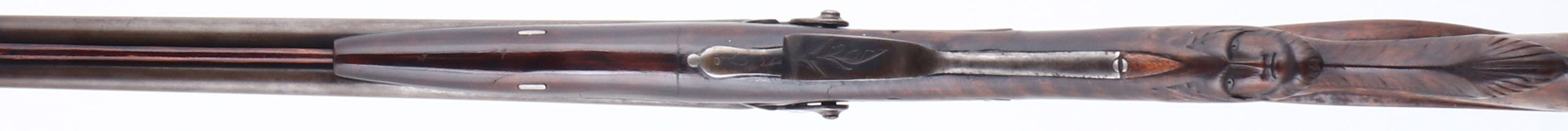Unknown, Muzzle loading Double Hammer Shotgun CAL: 20 GA, MFG: Antique, SN: N/A, Muzzle Loading Hammer SxS Shotgun, 29 1/4'' barrels. No markings found anywhere on the gun.. Best described as an antique & unique wall hanger. The checkered straight grip wood stock is good & solid, displaying a wonderful carved warrior face in the belly of the stock, along with other relief & cheek carvings. There is a toe repair & it appears that the forend portion of the stock was shortened & spliced. There are some minor scratches & contusions, & the checkering has smoothed. Much of the original finish has worn thin & the forend portion has been refinished. The metal is a mix of remaining blue & a thin brown in areas worn gun metal gray. Right nipple is missing & the left hammer screw is a replacement. The rib holds a single bead. Buttstock carries a smooth metal buttplate. Ram rod stored under barrels & in forend, with sling loop on the retention band. Hammers & triggers appear to function correctly. Antique, No FFL Req. - Value: 120 to 300