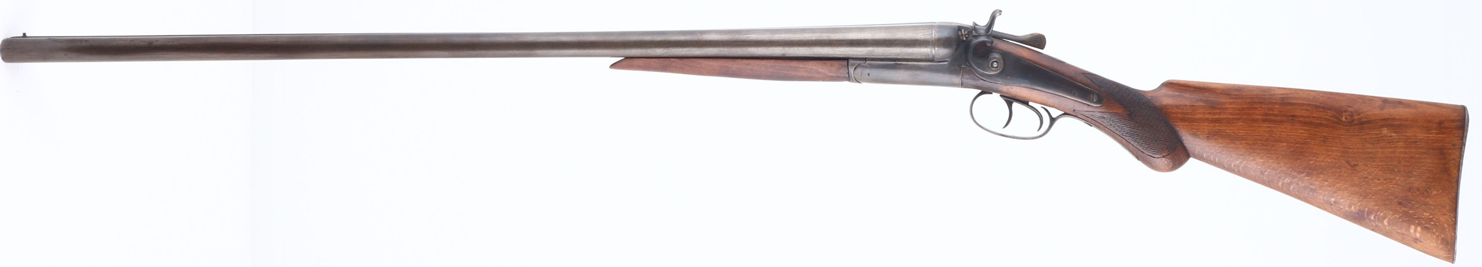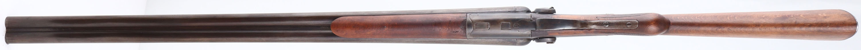 Richmand Arms, Double Hammer, CAL: 12 GA, MFG: 1890's, SN: 6397, Break Action Hammer SxS Shotgun, Choke: MOD/MOD, 30 1/4'' barrel, with ''Belgian Laminated Steel'' inscribed on the solid rib. The checkered & round knob pistol grip wood stocks are good & solid, having been sanded & refinished. The checkering on the forend is gone & there is some added filler on the right side of wrist above trigger, as well as some scratches remaining. The metal finish on the barrels & receiver is a spotty uneven mix of blue & brown added finish. Serial number on the barrel is ''5403'', while the water table is ''6397''. Bores are good. The solid, matted rib holds a single front bead. Buttstock carries the original metal buttplate. The head of the screw holding on the left hammer is broken off & the right hammer is held on with a brass nut. Break lever holds barrels, but has lost its spring. LOP: 14 1/4''. Antique, No FFL Req - Value: 100 to 300