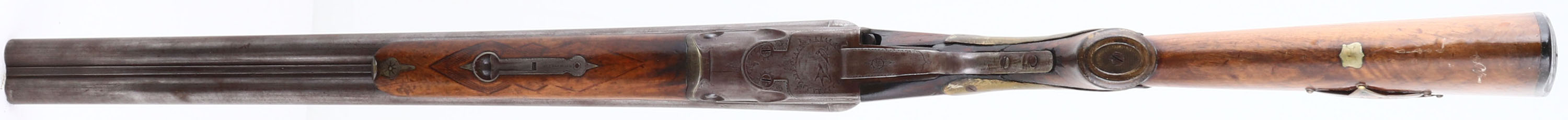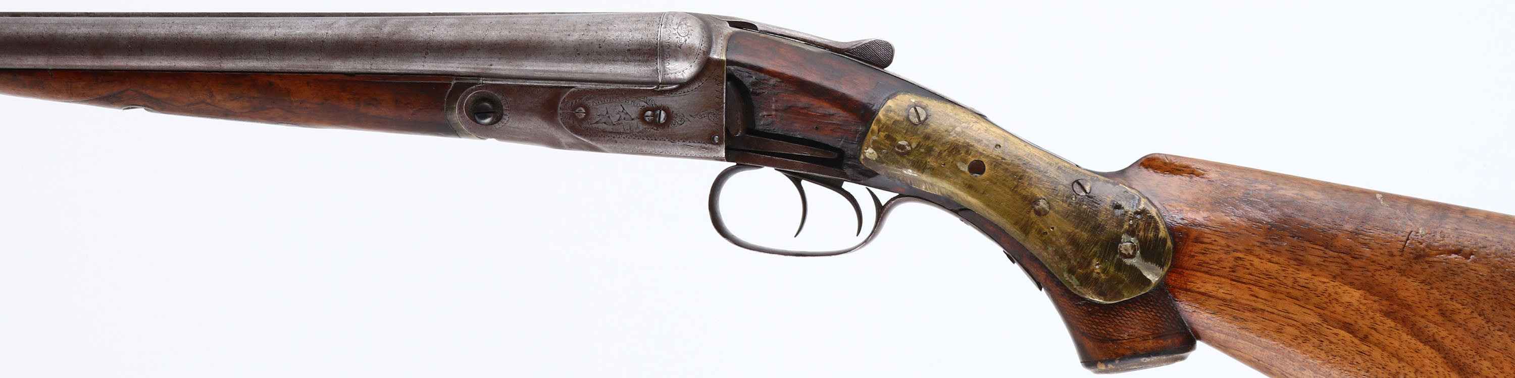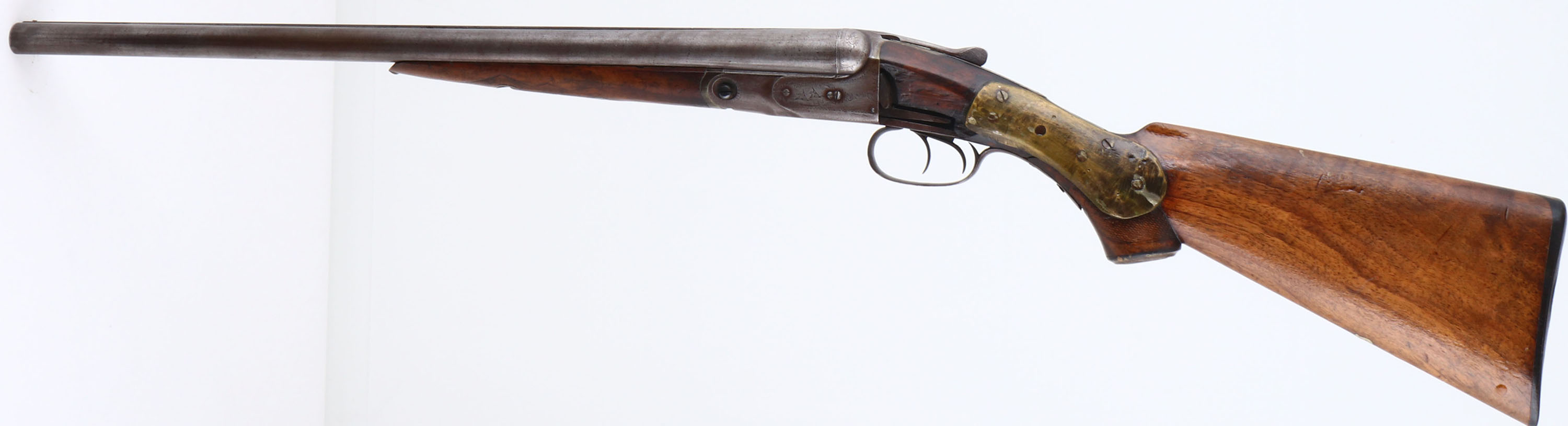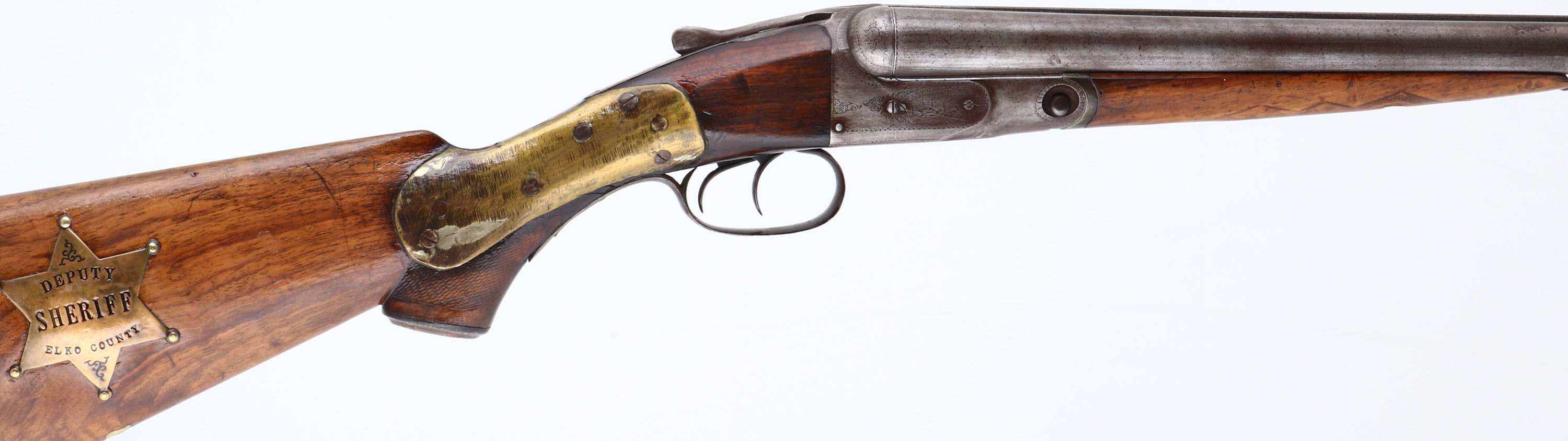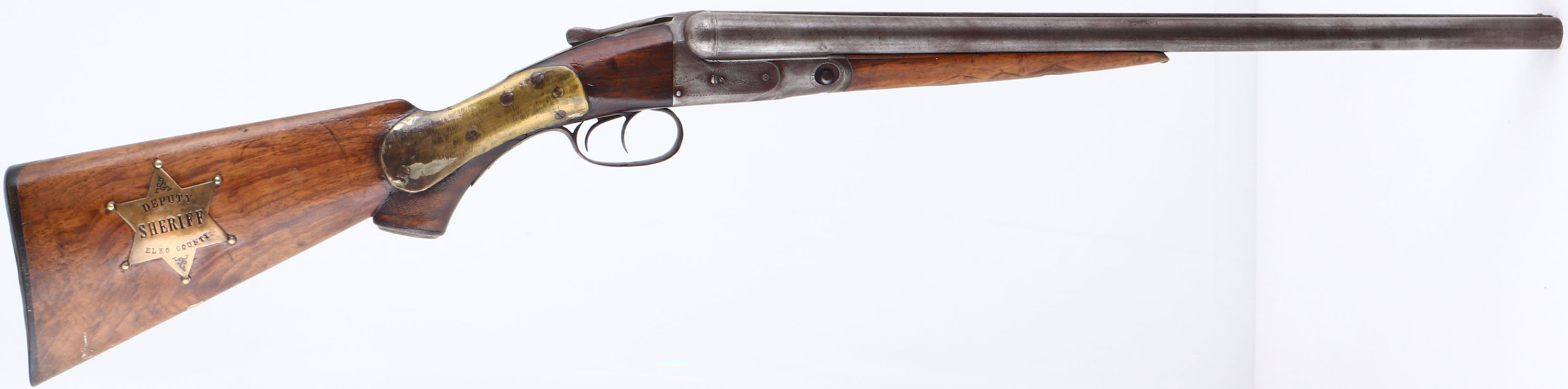 Parker Bros, Grade 2, CAL: 12GA, MFG: 1894, SN: 80792, SxS Break Action Shotgun, 21'' barrels. The checkered & capped pistol grip wood stock & forend are fair. The wrist is held together by two large brass plates & some fill. There is a sizeable piece missing on the left side of the wrist next to the receiver, but the stock remains solid. The stocks have been sanded & carry a thick lacquer finish. The bottom of the stock has an inlaid blank silver shield initial plate & the right side of the stock carries a badge marked ''DEPUTY SHERIFF ELKO COUNTY''. The Damascus pattern on the barrels is worn, but visible. The finish on the barrels & receiver has toned to metal grey, with a thin brown patina. The receiver, break lever & trigger guard all display ornamental borders, scroll engraving & bird game scenes on both the sides & bottom. Bores are good, with consistent roughness from age & use. The solid matted rib holds a single front bead. Stock carries a P.B checkered black plastic buttplate. No safety. Antique, No FFL Req. - Value: 300 to 600