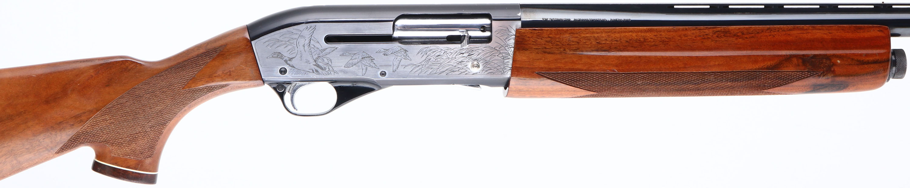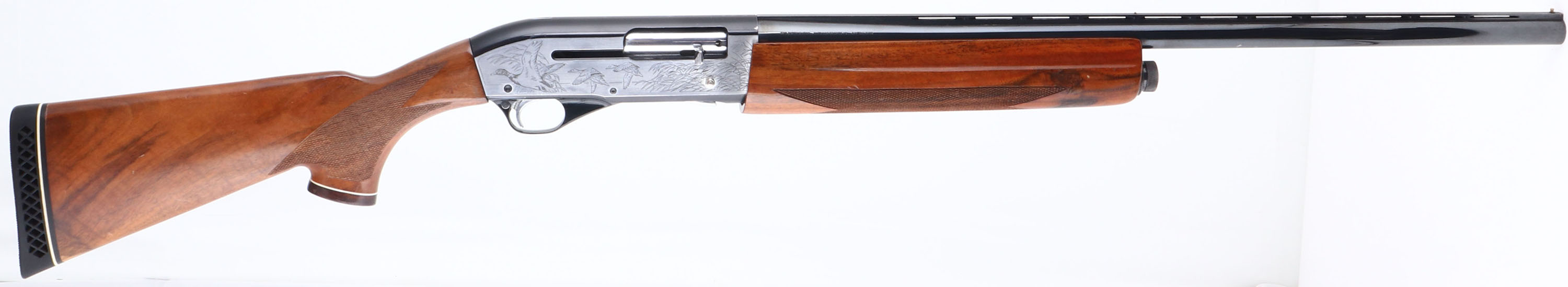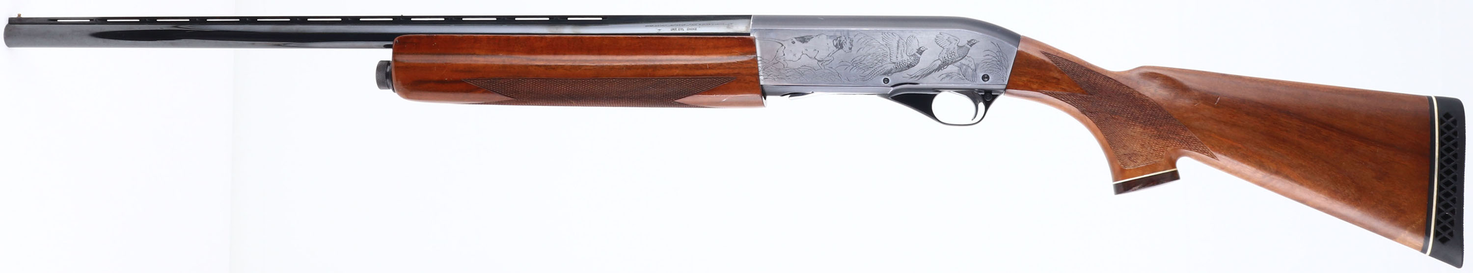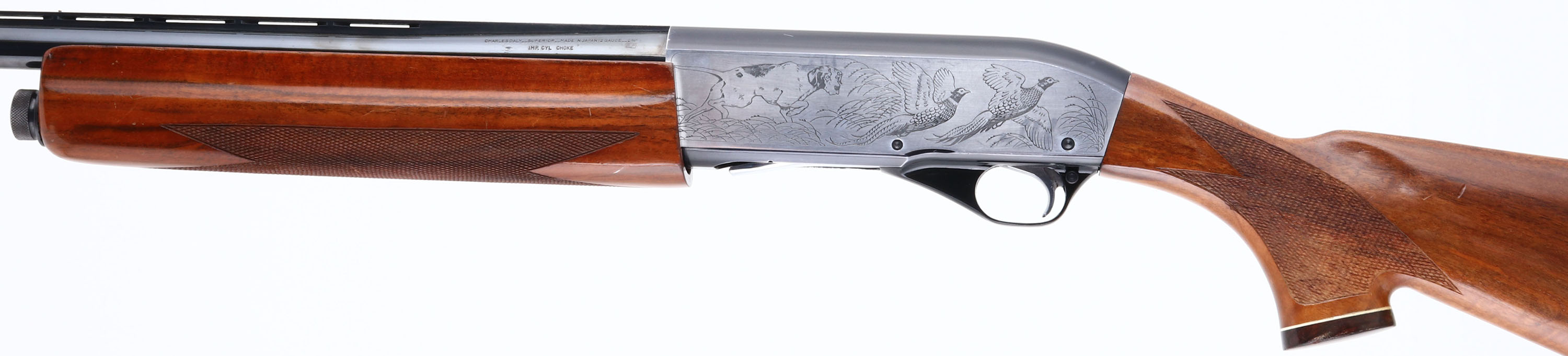 Charles Daly, Model Superior, CAL: 12 GA, MFG: Mid 1960's-73, SN: D0706, Semi-Auto Shotgun. 2 3/4'' IMP CYL, 26'' Ventilated rib barrel. These shotguns were produced in the Miroku Japan plant, which is the same plant that was producing Browning shotguns & rifles. The original checkered & capped pistol grip wood stocks are excellent. They display very few tiny contusions to the original finish. The original metal blue finish rates 95% on barrel, 90% on receiver, with the sides of the receiver being silver tone, with laser engraved bird hunting scenes. Bore is very good. The barrel holds a mid & front beads. Buttstock carries a Ventilated Pachmayr recoil pad. LOP: 14 1/4'' over pad. FFL or C&R Req. - Value: 400 to 800