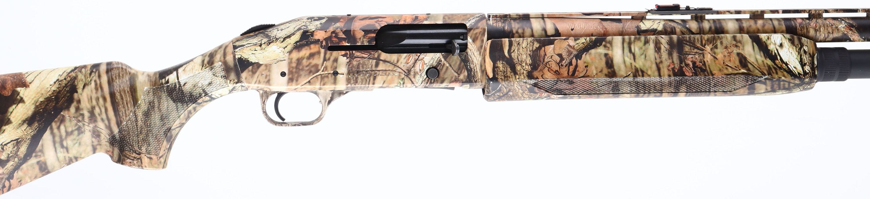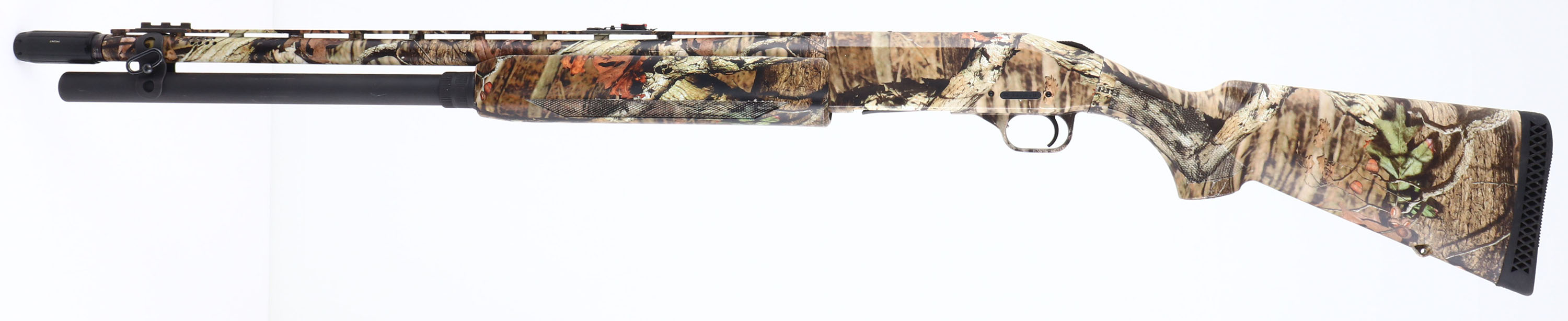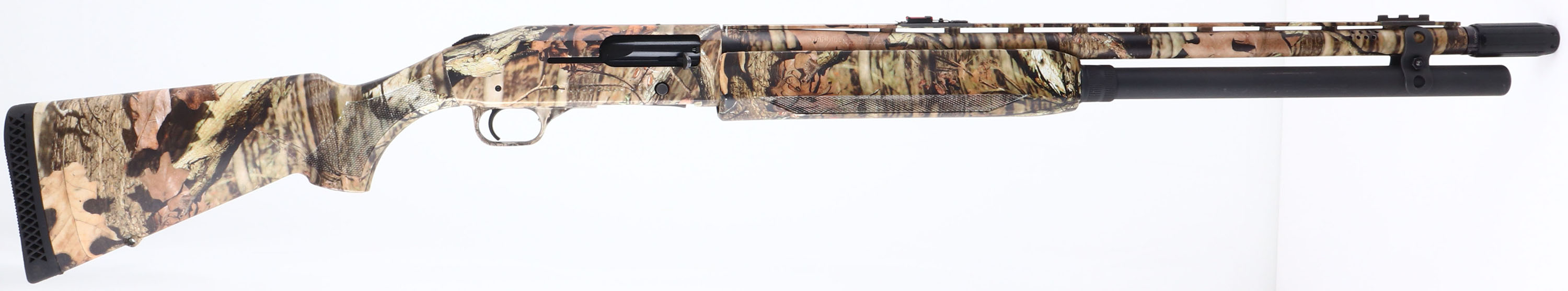 Mossberg, 930 Turkey, CAL: 12 GA, MFG: Modern, SN: AF172970, Pump Action Shotgun, 2 3/4'' & 3'', 24'' Ventilated barrel. 27'' with Accu-Choke twist choke system. The checkered & flat pistol grip synthetic stocks are excellent, with full coverage of the Mossy Oak Break-up Infinity camo pattern. The camo finish on the barrel & receiver is excellent, displaying very minor scuffs. Bore is excellent. The ventilated rib holds a dual red rod mid-rib sight & a front sight provision missing the rod. Has a Choate Tool Co. magazine tube added for extra capacity. Buttstock carries a Mossberg ventilated recoil pad. Integral sling provisions. The 930 is a very reliable, nearly indestructible pump shotgun that's ideal for all-round rugged use. FFL Req. - Value: 300 to 600