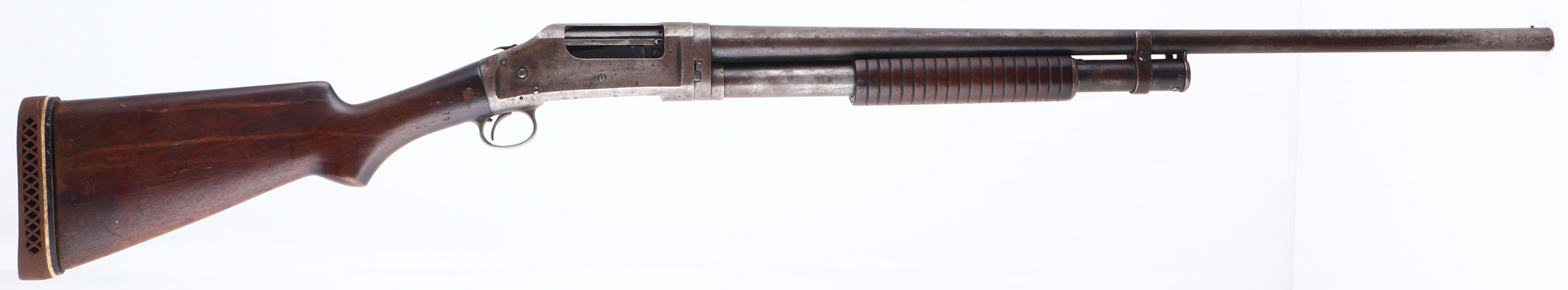 Winchester, Model 1897 Take-Down, CAL: 16 GA, MFG: 1907, SN: 363522, Pump Action Shotgun, Choke: Full, 28'' barrel. The original pistol grip stock & corncob forend are good & solid. The stocks have small scrapes, gouges & contusions to the thinning original finish. The stock has two 1'' stress cracks at the wrist & a couple of 2'' cracks at the buttend.. The left side of the stock ha ''L20452789'' carved into it. The metal finish has worn to a mix of gun metal gray & a rust brown patina, with spotting & light pitting. Bore is fair, with large spots of rust pitting. Barrel holds a single front bead. Stock carries a poor fitting ventilated recoil pad, which is loose. FFL or C&R Req. - Value: 200 to 400
