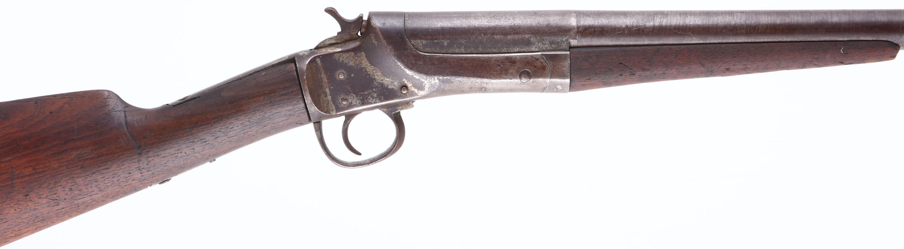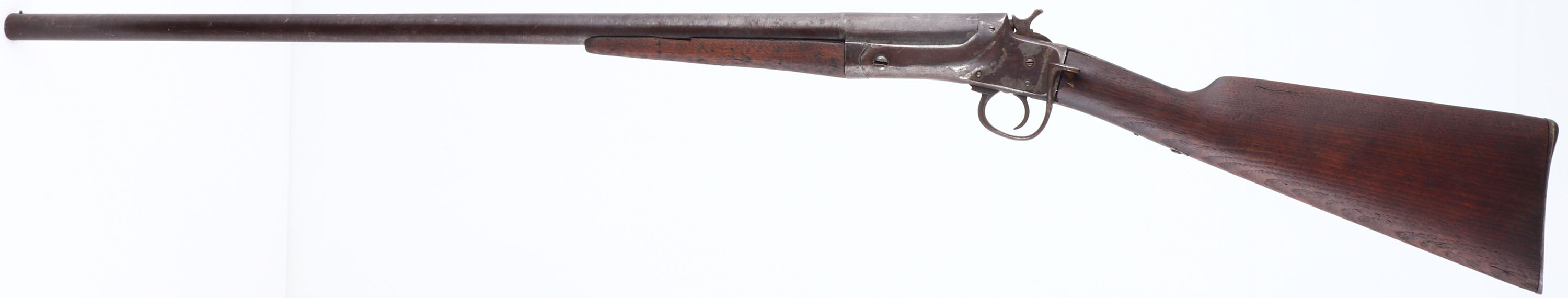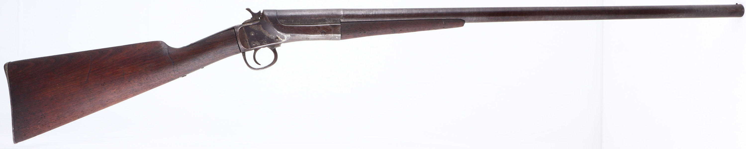 C.S Shattuck, American Side Snap, CAL: 14GA, MFG: 1880-90, SN: 1844, Side Lever Break Action Single Shot Shotgun, 30 1/8'' barrel. The straight grip wood stock & small forend are good. There are edge chips on both stocks, a small hairline crack at the top of the wrist & other contusions, scrapes & dings. The metal finish has toned to a brown patina, with metal grey undertones. Bore is fair, with consistent roughness & pitting. The barrel holds a single front bead. Smooth metal buttplate. Antique, No FFL Req. - Value: 100 to 200