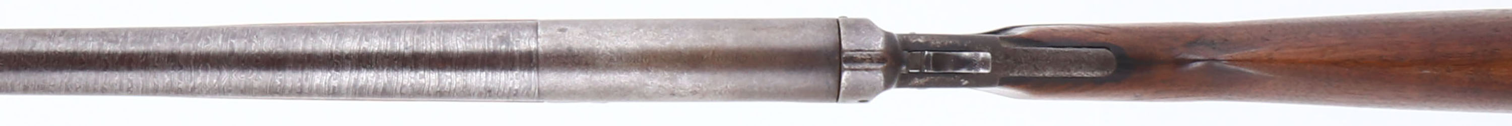C.S Shattuck, American, CAL: 12GA, MFG: 1895, SN: 638, Triggered Break Action Single Shot Shotgun, 34'' barrel. The round knob pistol grip wood stock & small forend are good. There are multiple cracks at the wrist, along with a couple edge chips & other contusions, scrapes & dings. The twisted steel pattern on the barrel is prominent, toned to a brown patina, with metal grey undertones & the receiver has worn to metal grey, toned to a brown patina. Bore is good, with consistent roughness & light pitting. The barrel holds a single front bead. Smooth metal buttplate. Antique, No FFL Req. - Value: 100 to 300
