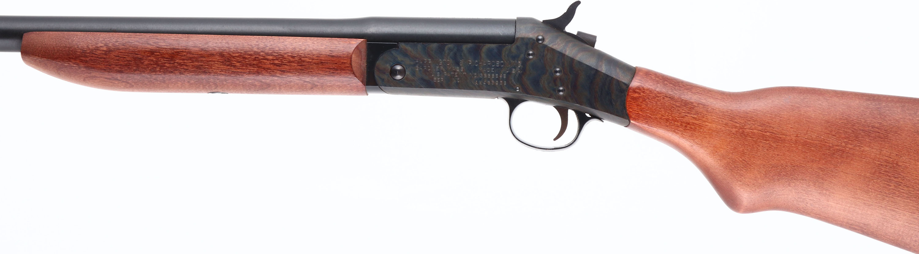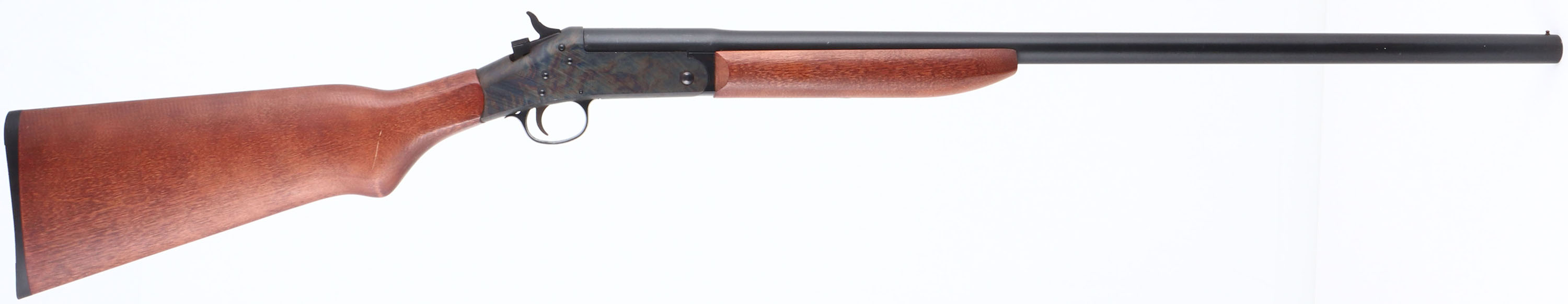 Harrington & Richardson, Topper Model 88, CAL: 12GA, MFG: 1981, SN: AX463989, Break Action Single Shot Shotgun, Choke: Full, 27 3/8'' barrel. The original round knob wood stock is excellent. There is only a couple minor handling marks. The metal blue finish on the barrel rates 98% & the receiver is case-hardened, retaining full case-colors. Bore is excellent, with intermittent roughness. The barrel holds a single front bead. H&R grooved plastic buttplate. FFL Req. - Value: 100 to 250