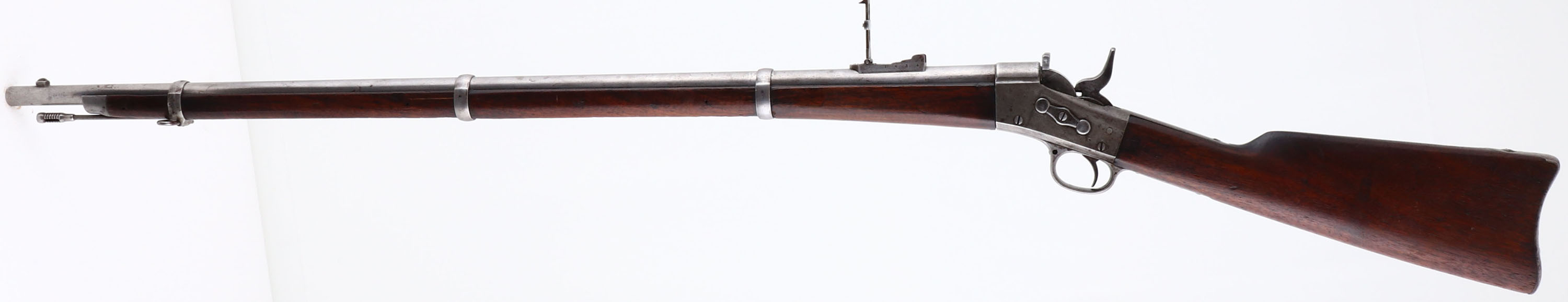 Remington, 1871 Rolling Block Rifle, CAL: 50-70, MFG: circa 1870's, SN: N/A, Single Shot Rolling Block Rifle, 36'' barrel. The upper tang is marked ''''Remingtons' Ilion N. Y. U. S. A. Pat. May3rd Nov 15th 1864 April 17th 1868 AMG 27th 1867 Nov 7th 1871''. The left side of the frame & all three barrel bands have a ''B'' stamping & the left side of the barrel has a ''S'' & the right side has a ''P''. There are non-legible cartouches on either side of the stock. There is a ''25'' cartouche ahead of the buttplate & the top of the buttplate is marked in three lines ''I'', ''S'', ''35''. The full length straight grip wood stock is very good & solid. There are edge chips around the cleaning rod insert, along with contusions, scratches & scrapes. The metal has fully worn to gun metal grey, with areas of spotting, toned to a brown patina. Bore is excellent & bright. The barrel holds a flip-up ladder rear sight, with graduations from 1 to 4 on the left side & 5 to 9 on the front face of the ladder & also holds a blade front sight. Smooth metal buttplate, with pitting. The state of New York purchased about 15,000 rolling block rifles and carbines from Remington circa 1872. These can be distinguished by the extremely high curved hammer spur, thumb lever for the breechblock that protrudes outward instead of up and the safety locking action which automatically returns the hammer to half cock when the breech is closed. They used the standard Remington military round top, rolling block action with a 36-inch round barrel in .50-70 caliber. We believe this to be one of those examples. Antique, No FFL Req. - Value: 1000 to 3000
