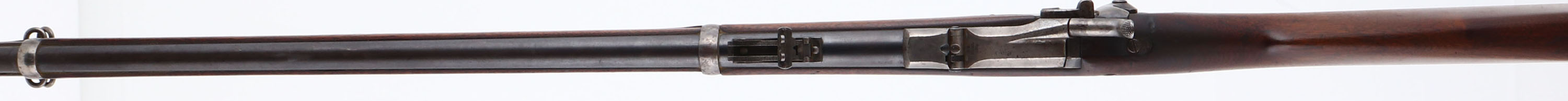 Springfield. Model: 1873. Cal: 45-70. MFG: 1881. S/N: 152985. Trapdoor breech loader. 32 1/2'' Barrel. The straight wrist wood stock is very good, scratches, dents, gouges, chips & wear from use/age, Cartouche on left side of stock above trigger that reads ''SWP 1881'' in box. Metal finish on barrel rates 60% with spots worn to a gun metal gray & spots being brown patina, receiver has worn to a even gun metal gray with no case hardening left. Lock plate has some bluing left & is marked with eagle, ''U.S. Springfield'', top of breech block is marked ''MODEL 1873'', rear of receiver is marked with S/N, left side of barrel is marked with ''V'' over ''P'' over Eagle, ''P'', both barrel bands marked with ''U''. Bore is good bright with light roughness amongst thinned rifling. Blade front sight, U-notch tangent/ ladder rear sight marked 1 to 5 on left side of base & 6 to 12 on ladder. Metal buttplate worn to a gun metal gray with spots of rust & brown patina, ''US'' marked on upper tang. Bottom sling swivel & stacking swivel, has cleaning rod. Antique No FFL Req. - Value: 300 to 600