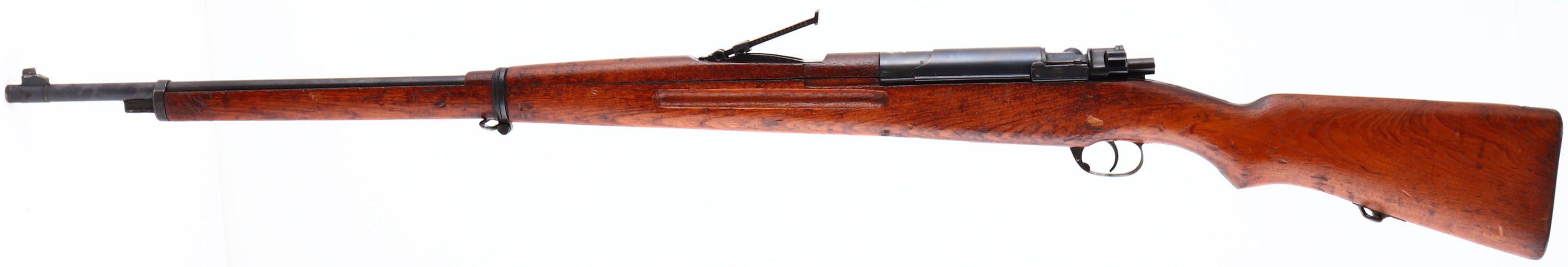 Koishikawa Arsenal, Model: type 46/66 CAL: 8 x 52mmR Siamese, MFG: 1903 - 08, S/N: N/A, Bolt Action Rifle, 29 3/8'' barrel. The semi-pistol grip wood stock is very good with contusions, scratches, scrapes & dings, faint type A cartouche on bottom of stock in front of sling swivel. The metal finish rates 95% overall. Top of receiver is marked with Siamese crest & ''R.S.121'' in Thai, receiver bridge is marked with original S/N in Thai Numerals & reads ''30450''. The left side of receiver is marked with Arsenal mark & type B stamp. Bore is very good, bright with light roughness in spots. The barrel holds a barleycorn front sight & V-notch ladder rear sight marked 2 to 20 in Thai Numerals. Buttstock carries a military style trapdoor buttplate, with brown patina & rust. missing cleaning rod. FFL or C&R Req - Value: 200 to 400