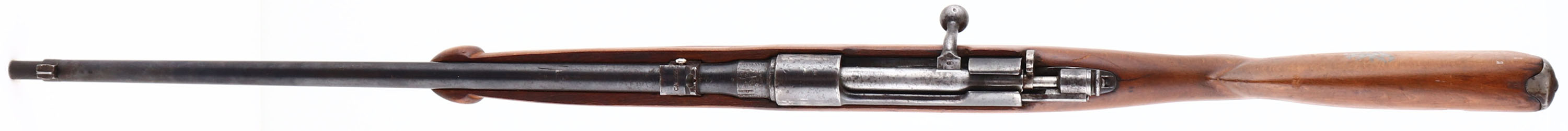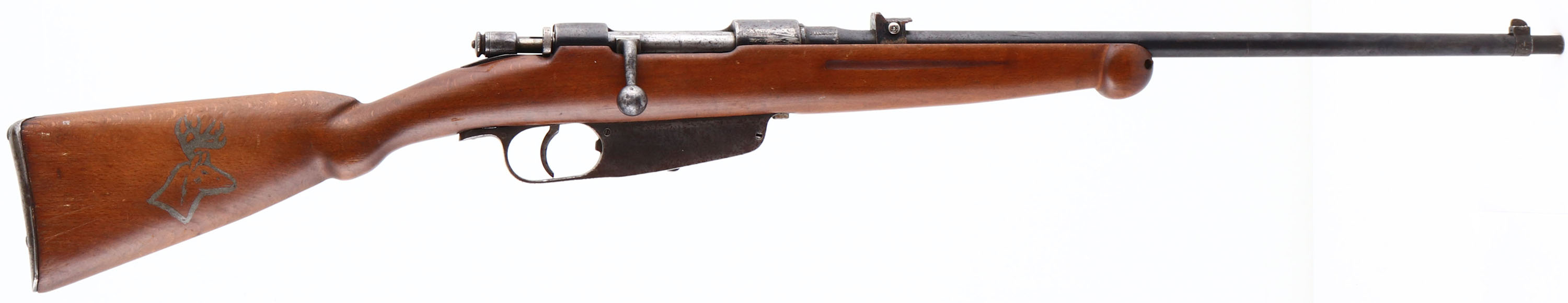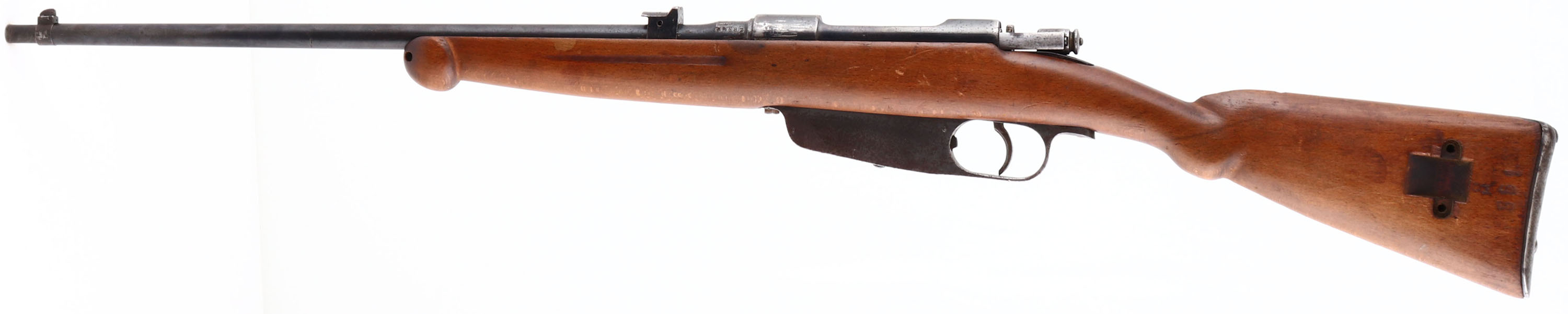 Terni, Model: M38 Carcano. Cal: 7.35x51mm, MFG: 1939, S/N: F6692, Bolt action rifle, 21 1/2'' Barrel. The semi pistol grip wood stock appears to be the original stock that has been heavily modified, sanded, & customized to have a semi pistol grip & a Schnabel forend, stock is good with scratches nicks dings & dents from age/use, read sling bar is missing, faint cartouche on left side of stock Infront of sling bar cutout, faint number marking on left side of stock right behind sling bar cutout, buck logo has been painted onto right side of stock. The metal finish rates 60% on the receiver with scratches, grind marks, thinned bluing, & brown patina, the metal finish rates 75% on the barrel with small spots of scratches, rust speckling & brown patina. Rear of barrel is marked with S/N, two ''SA'' in a box markings (indicating it was accepted into the Finnish military), crown over ''R E TERNI'', ''1939 XVII'', & other proof marks, rear sight is marked ''CAL 7,35''. Bore is very good, bright & defined rifling with roughness. Blade front sight, fixed deep V-notch rear sight. Metal trapdoor buttplate worn gray with brown patina, nothing inside trapdoor. FFL or C&R Req. - Value: 100 to 200