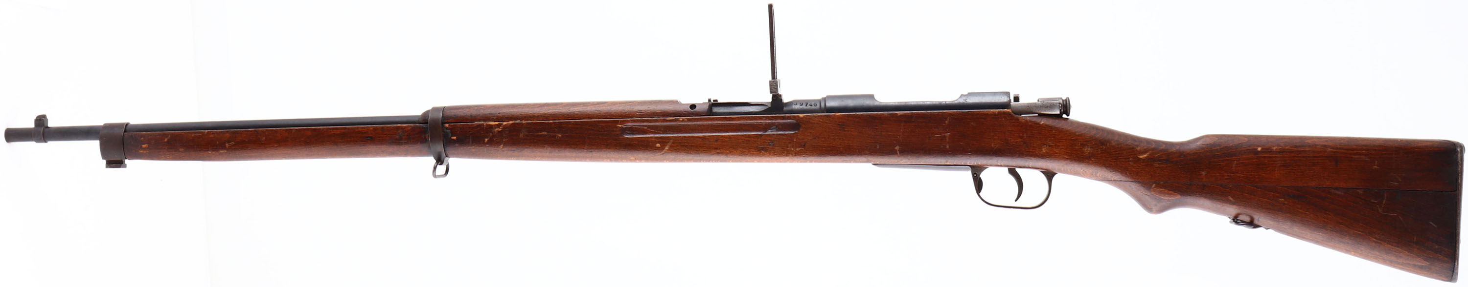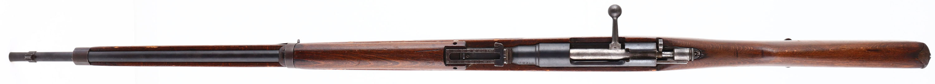 Italian, Type I Rifle, CAL: 6.5x50mmSR, MFG: 1938-39, S/N: G9746, Bolt Action Rifle, 30 1/2'' barrel. The semi-pistol grip wood stock is very good, with contusions, scratches, scrapes, nicks & dings, darkened with oils over time, glue on stock under the upper handguard, 3/4'' hairline crack on upper handguard by rear sight. The metal finish rates 85% overall, with a mix of metal grey & brown patina. The magazine floor plate & trigger guard have rust speckling. The left side of barrel is marked with S/N. Bore is good, bright with worn rifling near muzzle. The barrel holds a barleycorn front sight & V-notch ladder rear sight marked 5 to 24. Buttstock carries a military style buttplate, with brown patina & cleaned pitting. Missing cleaning rod. These rifles were made by the Italians under contact for the Japanese navy. FFL or C&R Req - Value: 200 to 400