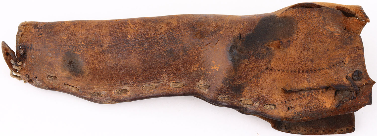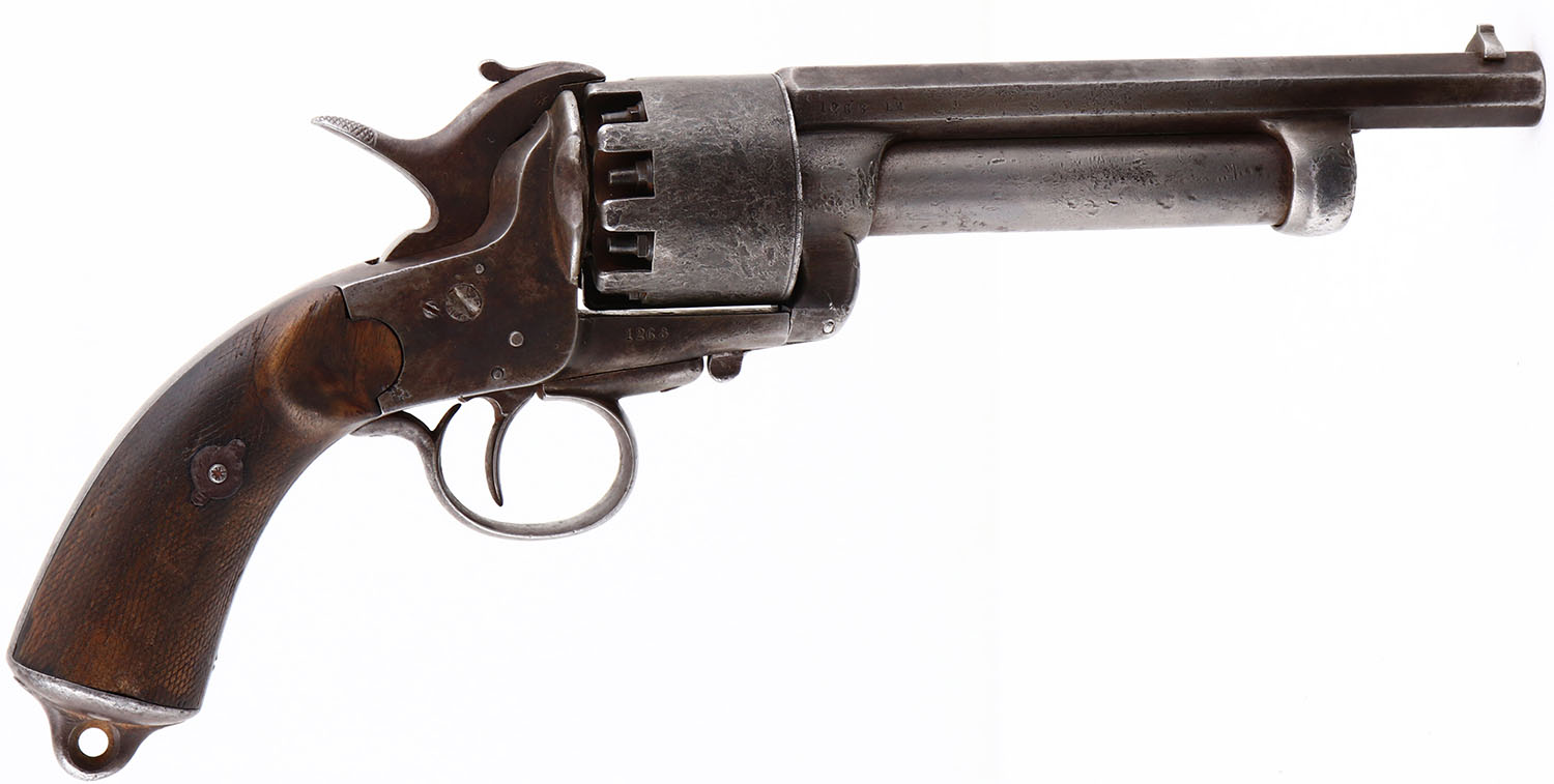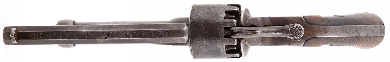 EXTREMELY RARE! LeMat, ''Grape-Shot'' Revolver, CAL: measures .42 & .64, MFG: 1856-65, SN: 1268, O/U Percussion Revolver, 6 3/4'' top barrel, 5'' lower barrel, 9 shot cylinder. This unique sidearm was known as the ''Grape-Shot'' revolver. It was developed in New Orleans, LA in 1856 by Jean Alexandre Le Mat, whose efforts were backed by P. G. T. Beauregard, who became a general in the Confederate States Army. When war broke out, LeMat received Confederate contracts to produce 5,000 revolvers. Plans were then made to manufacture the gun across seas & then import them into the Confederacy. Confederate gun runners were able to slip shipments of the gun through the U.S. Navy blockade & it is estimated that about 2,500 out of the 2,900 produced made it into Confederate service. LeMat's revolver were used by famous Confederate officers such as: Major Generals Braxton Bragg, J. E. B. Stuart, Richard H. Anderson, and Captain Henry Wirz. Confederate Major General J. E. B. Stuart was known to favor the LeMat revolver over others at the time. The top rib is marked ''Col. Le Mat Bte s-g-d-g Paris''. The right side of the barrel is marked with the full SN ''1268'' followed by a ''(star) over LM'' marking (collectors believe this to be Confederate). The SN is repeated on the right side of the frame. The left side of the hammer is marked with a ''0'' & the right side has a crude ''star''. The screws all have minor engravings, consistent with other seen examples. The original, checkered wood grips are excellent, with smooth checkering. The metal has worn to a mix of metal grey, remaining blue & brown patina, with cleaned pitting & dings throughout. Top bore is very good, with pitting & roughness amongst proud rifling. Bottom bore is very good, with consistent roughness. The barrel holds an original front sight. Lanyard loop present. Missing ram rod. Comes with an aged leather holster. This is your opportunity to own a rare piece of Civil War history.* Antique, No FFL Req. - Value: 10000 to 20000