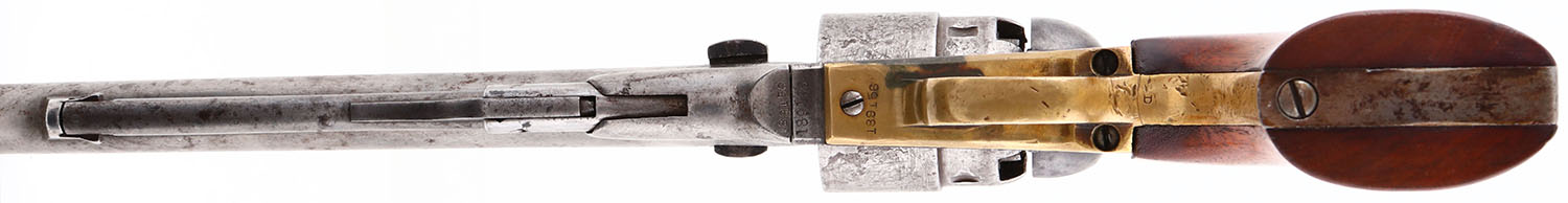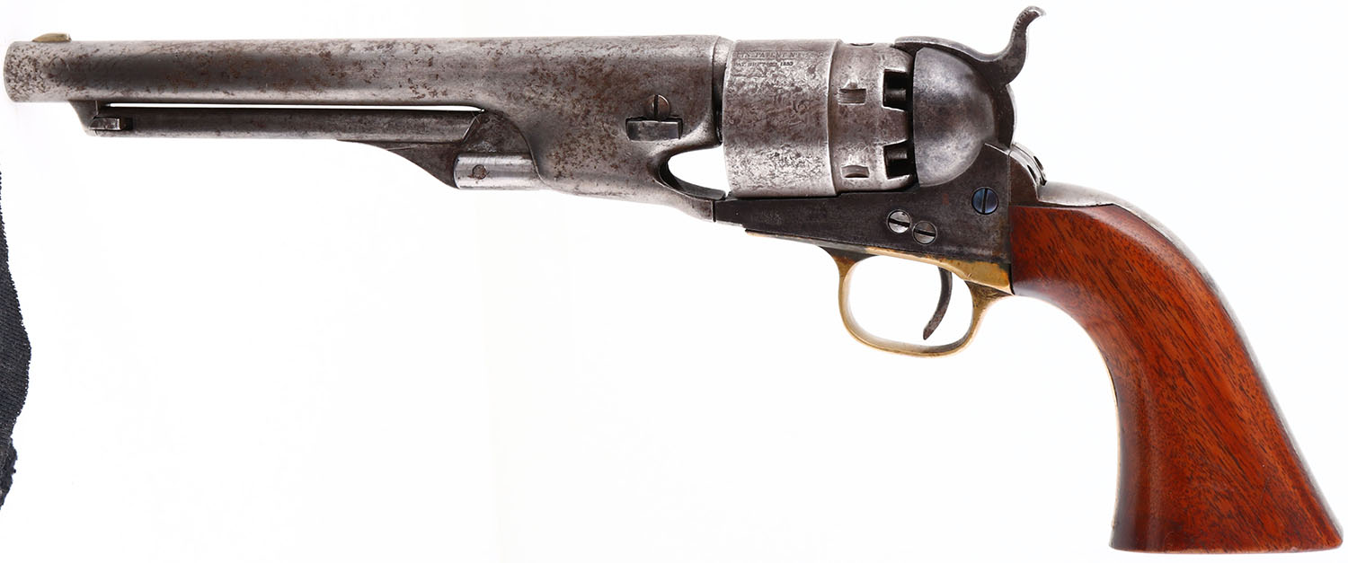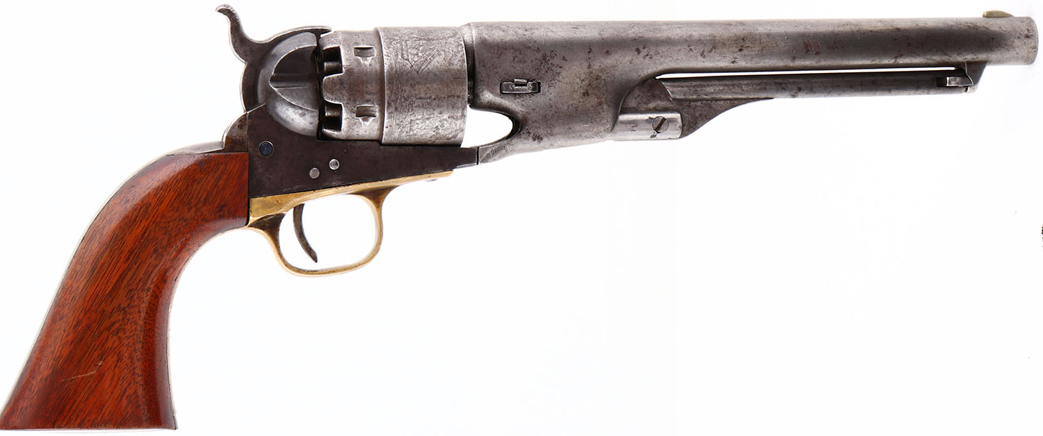 Colt, Model 1860 Army, CAL: .44, MFG: 1870, SN: 189156, Single Action Ball/Percussion Revolver, 7 7/8'' barrel. Civil War era revolver. The top of the barrel is roll-stamped: ''ADDRESS COL. SAML COLT NEW-YORK U.S AMERICA'' & ''COLTS PATENT'' is stamped on the left side of the frame. The Naval scene on the cylinder is faint, more visible in some areas than others. The full SN can be found on the trigger guard, frame & barrel housing. No SN on butt, cylinder has ''Patent No. 5293''. The brass trigger guard carries a ''D'' stamp. The replaced wood grips are excellent, with handling marks & minor scrapes. The metal finish has worn almost entirely grey, with areas of spotting/pitting toned to a brown patina & remnants of blue remaining on the frame. Bore is good, with roughness & pitting amongst strong rifling. Original front sight. Antique, No FFL Req. - Value: 800 to 1400