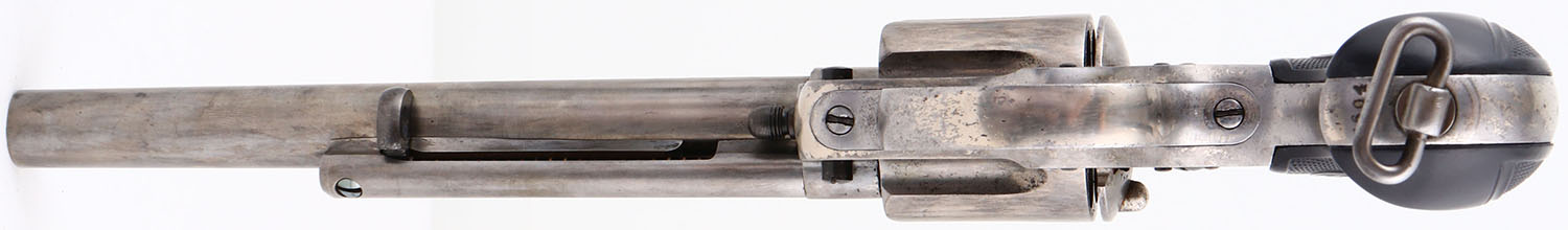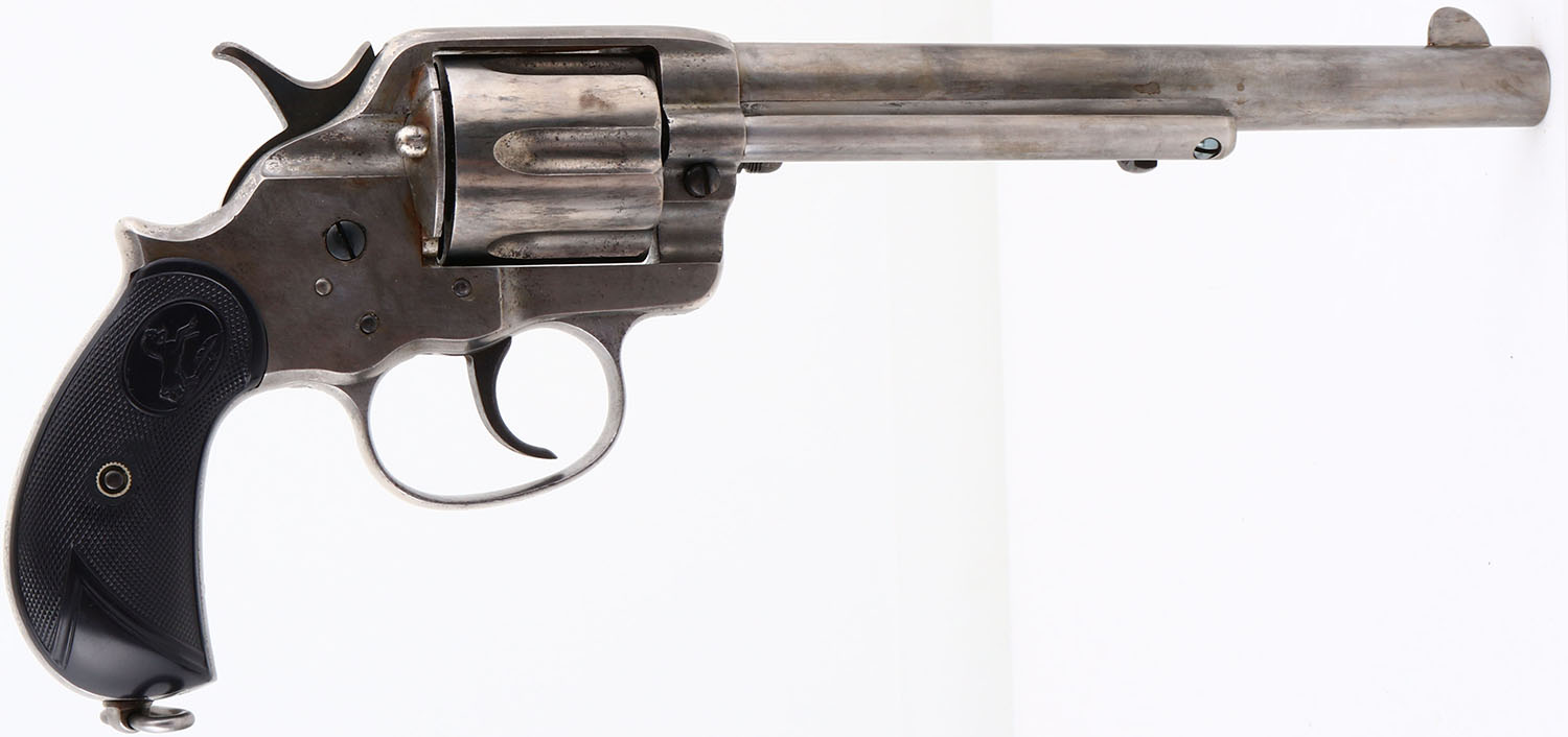 Colt, Frontier Six Shooter (Model 1878), CAL: .44WCF, MFG: 1882, SN: 7604, Double Action Revolver, 7 1/2'' barrel. The top of the barrel is marked ''COLT'S PT. F.A. MFG. CO. HARTFORD CT. U.S.A.''. The left side of the barrel is marked ''COLT FRONTIER SIX SHOOTER''. The markings appear to be modern restamp, with an acid etched side panel. The left side of the trigger guard is marked 44 CF & the bottom of the barrel is marked ''44''. The full SN can be found on the butt, ahead of the lanyard loop. The modern replica Rampant Colt checkered plastic grips are excellent. The metal has fully worn to gun metal grey, with areas of thin brown patina & dark brown spots from rust speckling. Bore is excellent & bright. The barrel holds a blade front sight. Lanyard swivel loop present. Cylinder has a bit of play when cocked. Antique, No FFL Req. - Value: 1200 to 2500