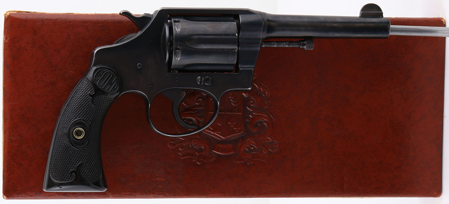 Colt, Police Positive, CAL: 38 SPL, MFG: 1919, SN: 162846, Double Action Revolver, 4'' barrel. The top of the barrel is marked in two lines ''COLT'S PT F.A. MFG. CO. HARTFORD CT. U.S.A.'', ''PAT'D AUG.5.1884 JUNE5.1900 JULY 4 1905''. The left side of the barrel is marked ''POLICE POSITIVE 38 SPECIAL''. The left side of the frame is marked with the Rampant Colt logo behind the cylinder release. The full SN can be found on the frame & cylinder swing gate. The original, Colt marked checkered hard rubber grips are excellent. The restored metal blue finish rates 98%, with cleaned pitting underneath. Bore is excellent & bright, with intermittent roughness. The barrel holds a blade front sight. Comes in a non-factory box. FFL or C&R Req. - Value: 400 to 800