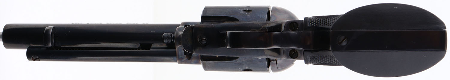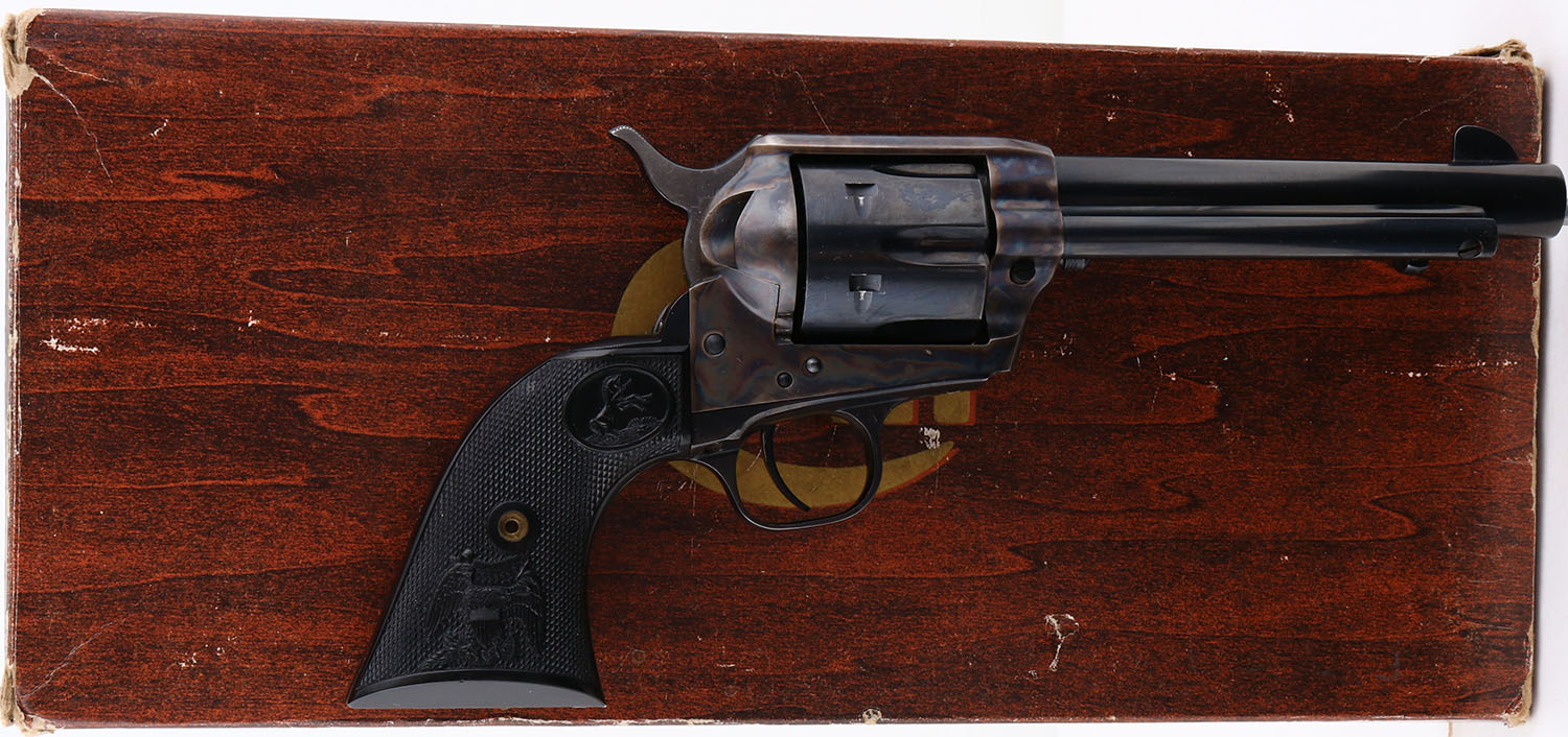 BOXED, Colt, Model Single Action Army, Sheriffs Model, (P1850), CAL: 45, MFG: 1975, SN:70709SA, Single Action Revolver, 5 1/2''' barrel. The left side of barrel is stamped ''COLT SINGLE ACTION ARMY .45''. The original Eagle & Rampant Colt, checkered grips are Mint. The metal blue finish on the barrel & cylinder rates 98%, with loss at barrel tip & slight cylinder loss. Bore is mint. The barrel holds a tall front blade. Comes with the colt purchase letter from Colt President, in the original wood grain box, with paperwork & extra cylinder rod. Excellent boxed Colt revolver. FFL Req. - Value: 1500 to 2500