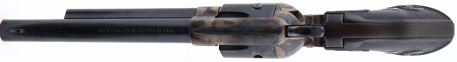 BOXED, Colt, Model PEACEMAKER, CAL: 22 LR, MFG: 1975, SN:G156765, Single Action Revolver, 6''' barrel. The left side of barrel is stamped ''PEACEMAKER .22''. The gun still carries the factory grease. The original Eagle & Rampant Colt, checkered grips are Mint. The metal blue finish on the barrel & cylinder rates 100%. The case-hardened frame displays vivid case-colors. Bore is mint. The barrel holds a front blade. Comes in a Colt wood grain box with paperwork & hang tag. A fantastic Colt Peacemaker. FFL Req. - Value: 1500 to 2500