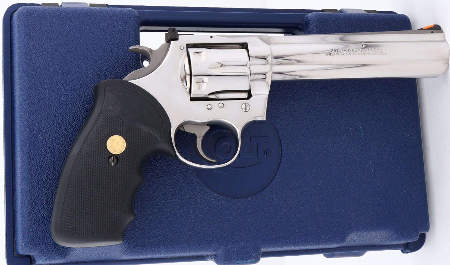 RARE CASED, Colt, Model KING COBRA, CAL: 357 MAGNUM, MFG: 1989, SN:C5904K, Double Action Revolver, 6''' barrel. First introduced in 1986, the Colt King Cobra is a medium ''V'' frame double-action revolver made of very hi-grade carbon steel & featuring a six round cylinder. The mirror bright stainless finish in both 4'' & 6'' lengths were offered from 1988-1992. It was marketed to both aw enforcement agencies & civilian firearms enthusiasts. Two subsequent offerings of this model were later produced, however collectors gravitate to the early production models, which subsequently demand a higher collector value. The left side of barrel is stamped ''KING COBRA''.