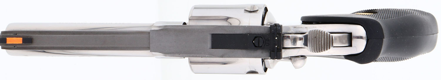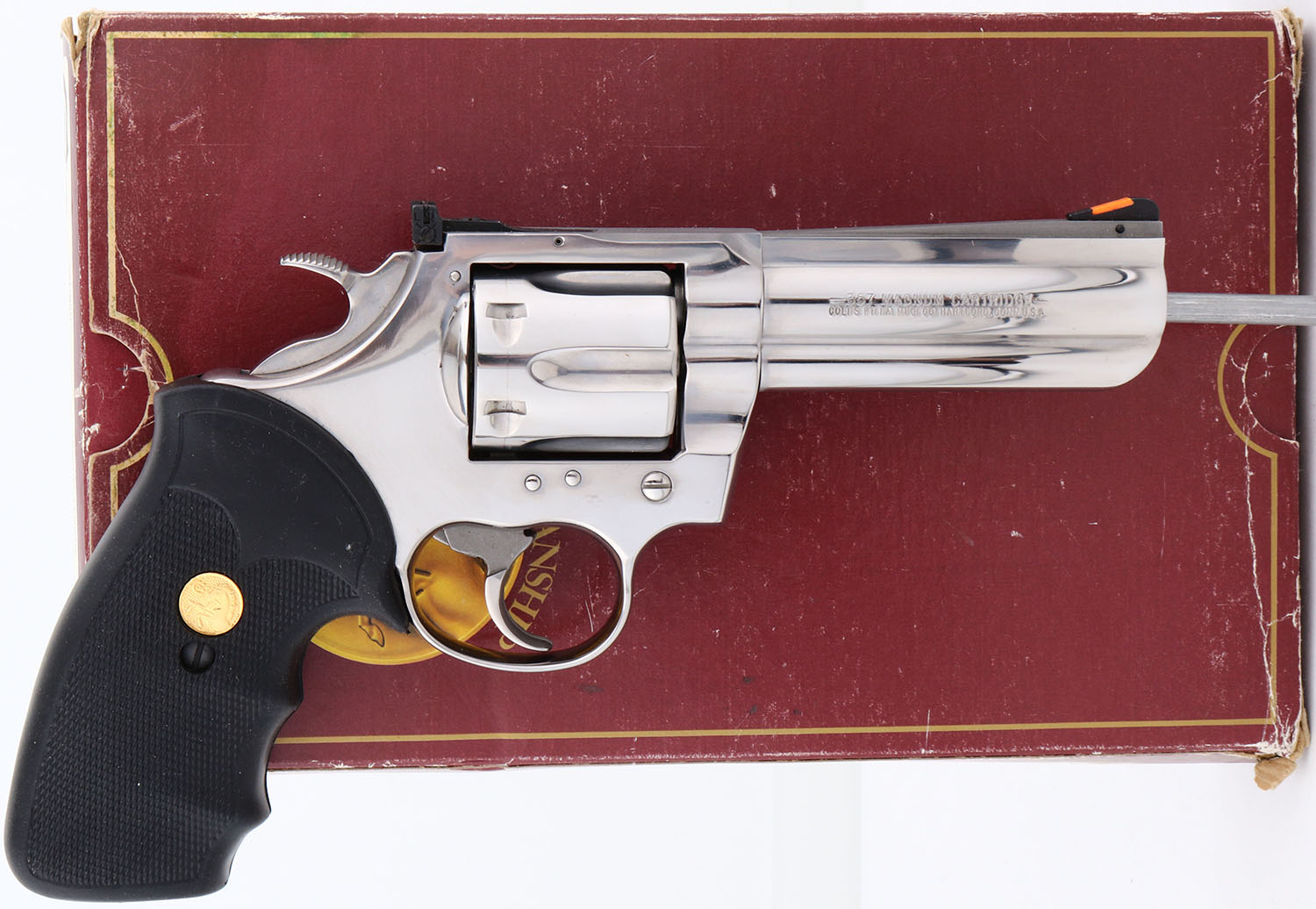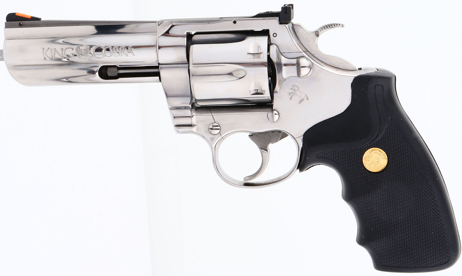 NEW BOXED, Colt, Model KING COBRA, (AA3041) CAL: 357 MAGNUM, MFG: 1989, SN:KA0568, Double Action Revolver, 4'' barrel. First introduced in 1986, the Colt King Cobra is a medium ''V'' frame double-action revolver made of very hi-grade carbon steel & featuring a six round cylinder. The mirror bright stainless finish in both 4'' & 6'' lengths were offered from 1988-1992. It was marketed to both law enforcement agencies & civilian firearms enthusiasts. Two subsequent offerings of this model were later produced, however collectors gravitate to the early production models, which subsequently demand a higher collector value. The left side of barrel is stamped ''KING COBRA''. The right side ''357 MAGNUM''. They came with Colt gold medallion Pachmayr black checkered rubber grips, with finger grooves. The grips on this example are mint. The mirror bright stainless finish is mint. Bore is mint. The matte finished top of the barrel holds a screw height adjusting ''U'' notch rear sight & front blade, with the serrated orang insert. This gun comes in its original Colt burgundy box, with instruction manual. NOS. Nearly Mint in every way & extremely collectible. FFL Req. - Value: 2500 to 3500