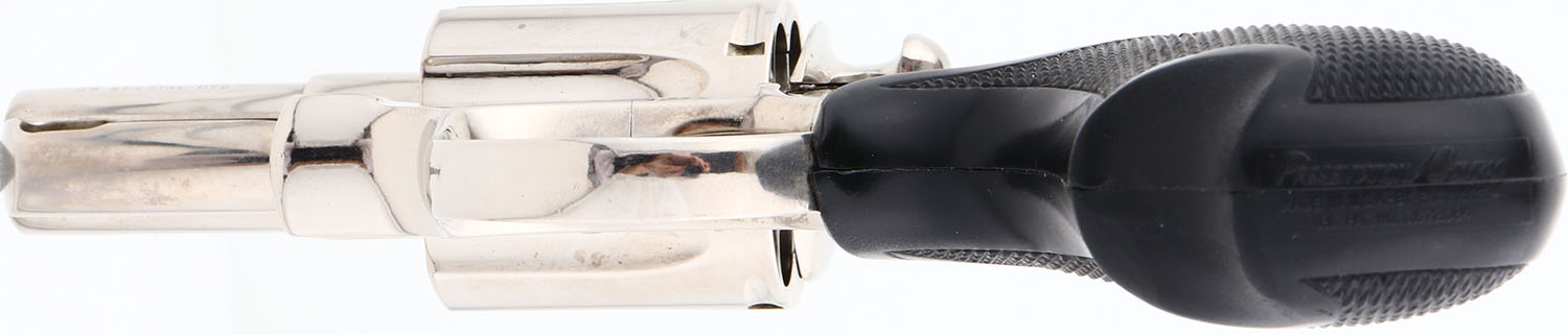 Colt, Model COBRA, (Second Issue) CAL: 38 Special, MFG: 1977, SN: 97188M, Double Action Revolver, 2'' barrel. The Colt Cobra is a lightweight, aluminum-framed, double-action short-barreled revolver. It was made in 3 models: the First Model, made from 1950-71 & weighing 15 ounces unloaded with 2'' barrel, & an improved Second Model, made from 1972-81, recognizable by its shrouded ejector rod & Baughman-style ramp front sight, with an unloaded weight of 16 ounces. The third issue debuted from 2017. The left side of barrel is stamped ''COBRA .38 SPECIAL CTG''. They came with Colt gold medallion Pachmayr black checkered rubber grips, with pinky groove. The grips on this example are very good, with a rub & wear on the lower right side front edge. The mirror bright nickel finish is excellent, but does have some haze & fine brush lines. Bore is excellent. A collectible & popular short barreled snake revolver. FFL Req. - Value: 800 to 1500