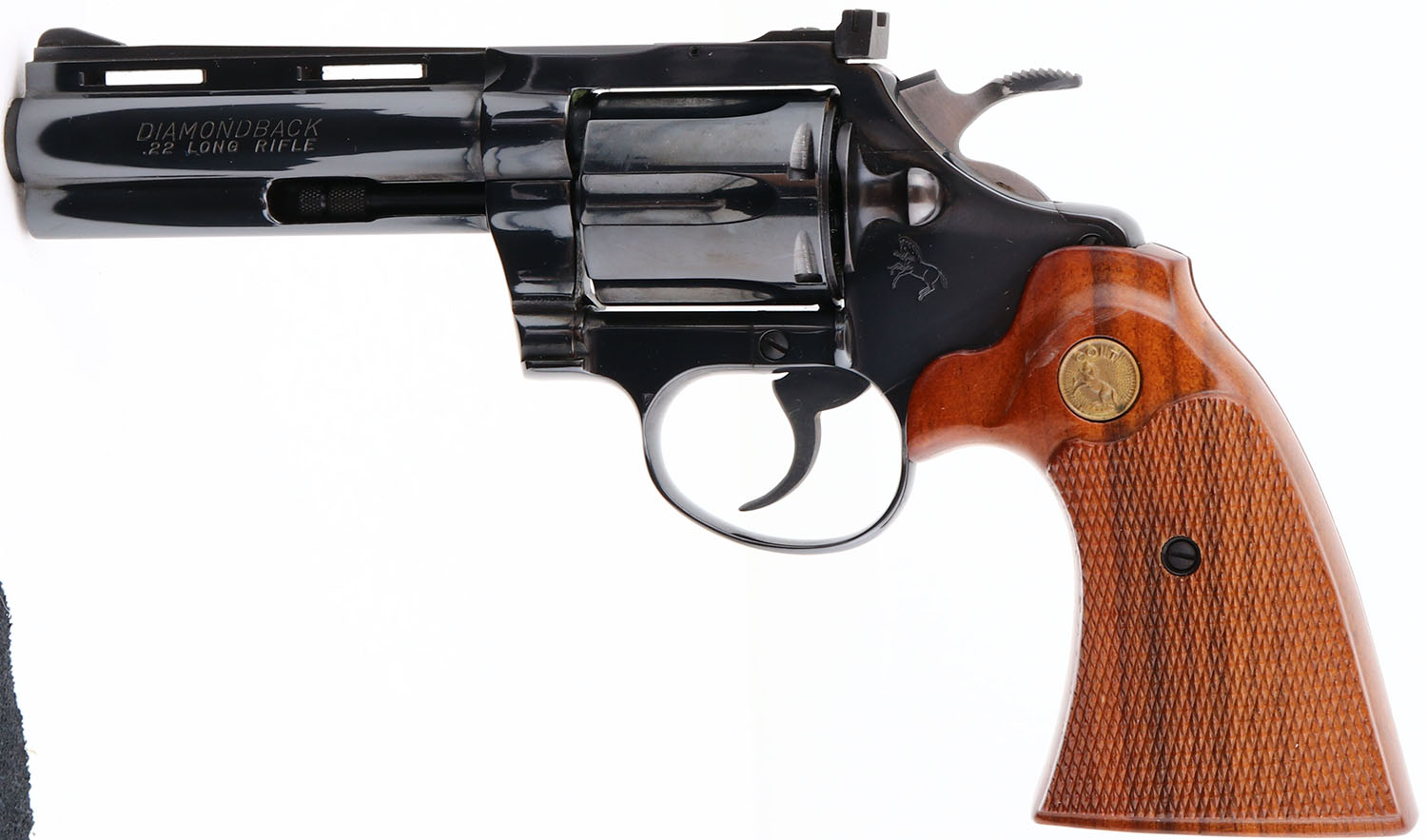 NEW BOXED, Colt, Model Diamondback, (D5140) CAL: 22 LR, MFG: 1977, SN:N13516, Double Action Revolver, 4'' barrel. The Colt Diamondback was introduced as a deluxe model in 1966, inspired by the successful Colt Python, in calibers of .22 LR, .22 WMR & .38 SPL. The Diamondback is built on the smaller ''D frame'', same as used in the Detective Special. It has a 6-shot swing-out cylinder & was available in blue or nickel finishes. It has a wide serrated target hammer, ventilated rib, fully adjustable target quality sights, & full-length barrel underlug. The left side of barrel is stamped ''DIAMONDBACK 22 LONG RIFLE''. They came with Colt brass medallion, checkered Walnut grips. The grips on this example are mint. The high polish metal blued finish is mint. Bore is mint. The matte finished top of the ventilated rib barrel holds a screw height adjusting ''U'' notch rear sight & front blade sight. This gun comes in its original Colt wood grain box, with Colt purchase letter, instruction manuals, hang tag. Screw driver tool coin, bag wrappings. Consigned by original buyer who claims it was never shot outside factory test. NOS. Nearly Mint in every way & extremely collectible. FFL Req. - Value: 2000 to 3000
