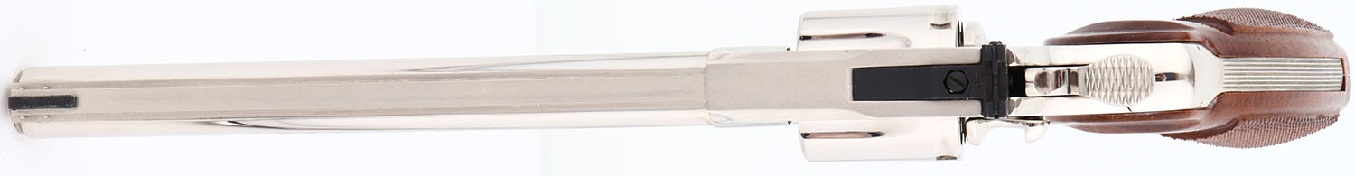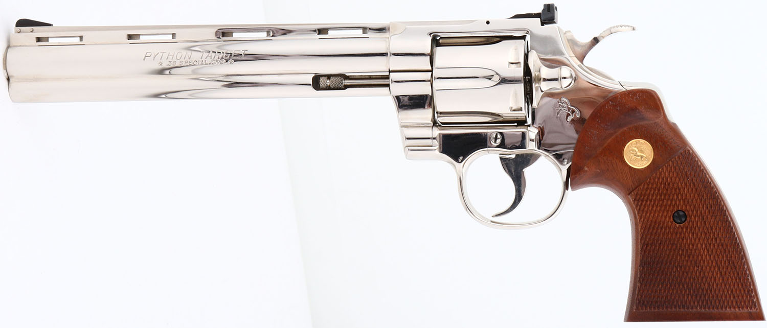 EXTREMELY SCARCE BOXED, Colt, Model Python TARGET, (I3686), CAL: .38 SPL-, MFG: 1980, SN: K02878, Double Action Revolver, 8'' barrel. In 1980 Colt produced 3,740 Phyton Target models with 8'' barrels in .38 SPL. Of those produced 3,489 were blued & only 251 nickeled. This is one of those rare 251 mfg, in nickeled finish, making this Python variation extremely rare. The Colt Python was introduced as a premium model in 1955, in caliber .357 Magnum, with some rare caliber variations produced along the way. The Python is built on the large I-frame & has a reputation for accuracy, smooth trigger pull, & a tight cylinder lock-up. It has a 6-shot swing-out cylinder & was available in Python blue, Royal blue, Python nickel & Python stainless steel finishes. Some firearm collectors & writers have described the Python as ''the finest production revolver ever made''. It has a wide serrated target hammer, ventilated rib, & fully adjustable target quality rear sights. The left side of barrel is stamped ''PYTHON TARGET * .38 SPECIAL CTG * ''. The Rampant Colt gold medallion, checkered walnut grips on this example are minty. The high polish nickel finish is minty. Bore is mint. The satin finished top of the ventilated rib barrel holds a screw height adjusting ''U'' notch rear sight & black front blade sight. This gun comes in its original Colt wood grain box, with booklet, pamphlet, hang tag & bag. Box has tattered edges, splitting seams & missing a flap. Consignor indicates revolver was never shot outside the factory. Highly collectible stainless steel variation. FFL Req. - Value: 3500 to 4500