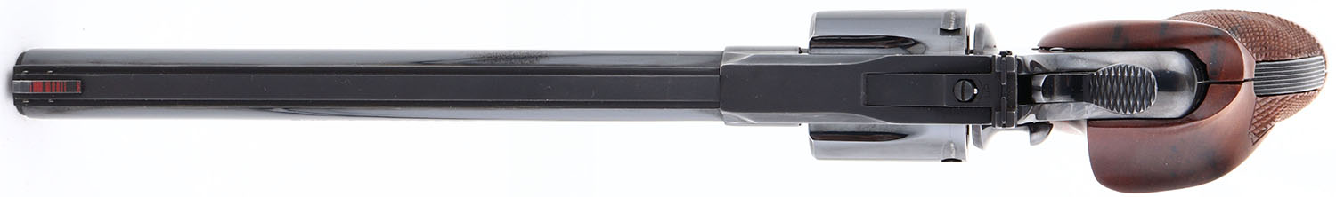 SCARCE BOXED, Colt, Model Python TARGET, CAL: .38 SPL-, MFG: 1980, SN: VA9049, Double Action Revolver, 8'' barrel. In 1980 Colt produced 3,740 Phyton Target models with 8'' barrels in .38 SPL. Of those produced 3,489 were blued & only 251 nickeled. The Colt Python was introduced as a premium model in 1955, in caliber .357 Magnum, with some rare caliber variations produced along the way. The Python is built on the large I-frame & has a reputation for accuracy, smooth trigger pull, & a tight cylinder lock-up. It has a 6-shot swing-out cylinder & was available in Python blue, Royal blue, Python nickel & Python stainless steel finishes. Some firearm collectors & writers have described the Python as ''the finest production revolver ever made''. It has a wide serrated target hammer, ventilated rib, & fully adjustable target quality rear sights. The left side of barrel is stamped ''PYTHON TARGET * .38 SPECIAL CTG * ''. The custom order thumb target grips are excellent, with crisp checkering, near mint. The metal blue finish is minty. Bore is mint. The satin finished top of the ventilated rib barrel holds a screw height adjusting ''U'' notch rear sight & black serrated blade front sight. This gun comes in a blue Colt hard case, with owners manual. FFL Req. - Value: 3000 to 4000