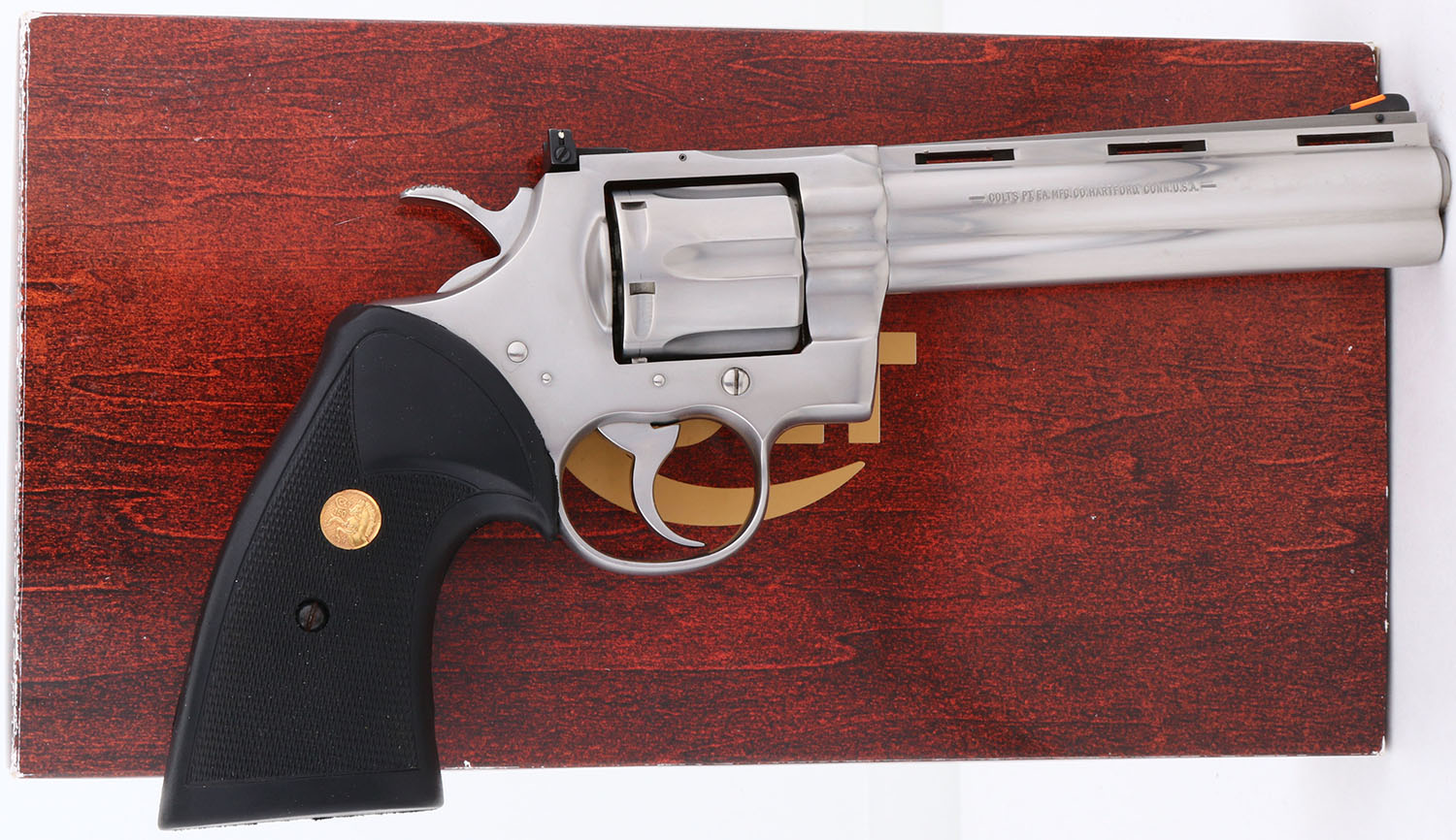 BOXED, Colt, Model Python, CAL: .357 Magnum, MFG: 1994, SN: PY9118, Double Action Revolver, 6'' barrel. The Colt Python was introduced as a premium model in 1955, in caliber .357 Magnum. The Python is built on the large I-frame & has a reputation for accuracy, smooth trigger pull, & a tight cylinder lock-up. It has a 6-shot swing-out cylinder & was available in Python blue, Royal blue, Python nickel & Python stainless steel finishes. Some firearm collectors & writers have described the Python as ''the finest production revolver ever made''. It has a wide serrated target hammer, ventilated rib, & fully adjustable target quality rear sights. The left side of barrel is stamped ''PYTHON 357 * .357 MAGNUM CTG * ''. The Rampant Colt gold medallion, checkered Pachmayr grips on this example are mint. The high satin stainless steel finish is excellent. Bore is mint. The satin finished top of the ventilated rib barrel holds a screw height adjusting ''U'' notch rear sight & front blade sight, with serrated orange insert. This gun comes in a reproduction Colt wood grain box, with bag. Highly collectible stainless steel variation. FFL Req. - Value: 1500 to 2500