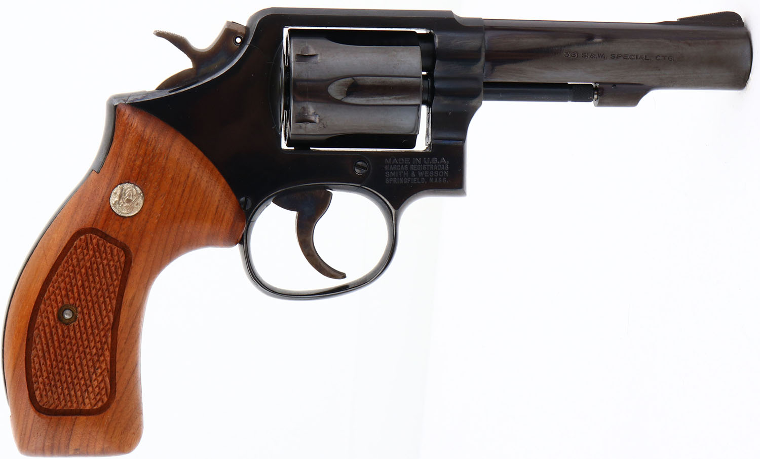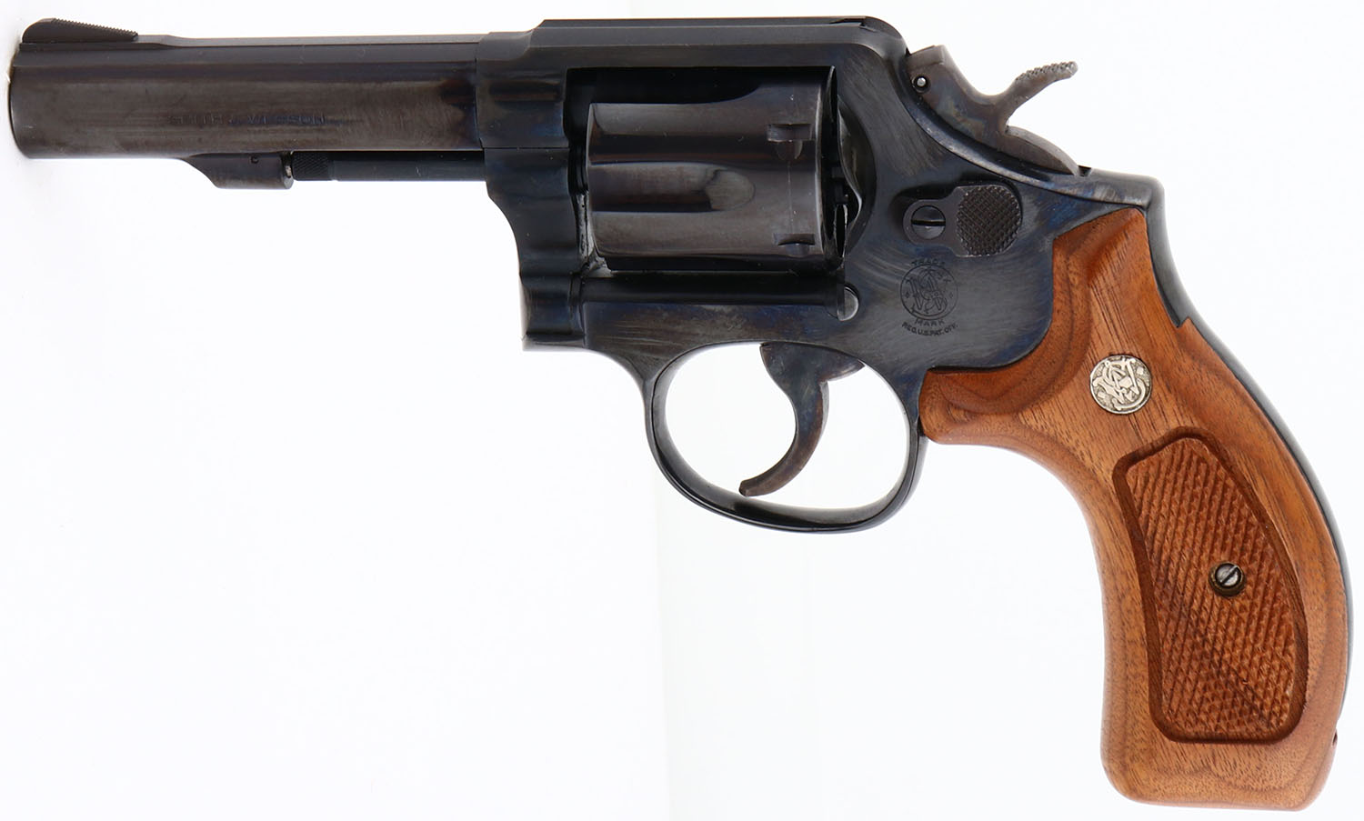 Smith & Wesson, Model 10-8, CAL: 38 S&W SPL, MFG: 1977, SN: D66407, Double Action Revolver, 4 1/4'' barrel. The S&W brass logo medallion, checkered wood grips are excellent. The metal blue finish rates 99% overall. The hammer & trigger are case-hardened, retaining full case-colors. Bore is excellent. The barrel holds a serrated blade front sight. FFL Req. - Value: 500 to 900