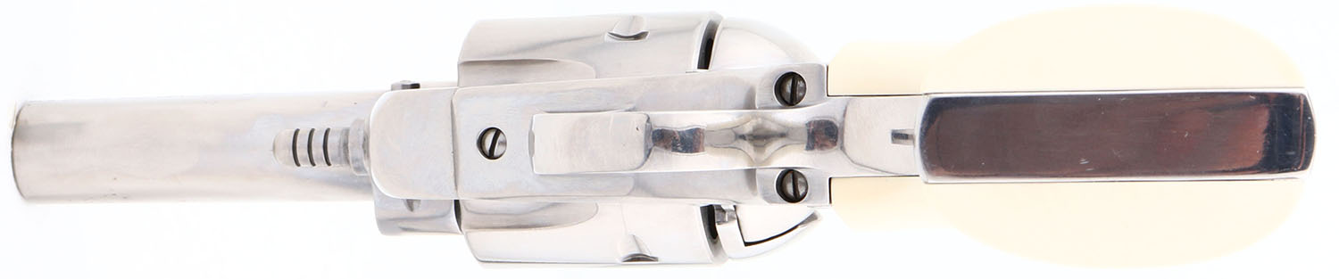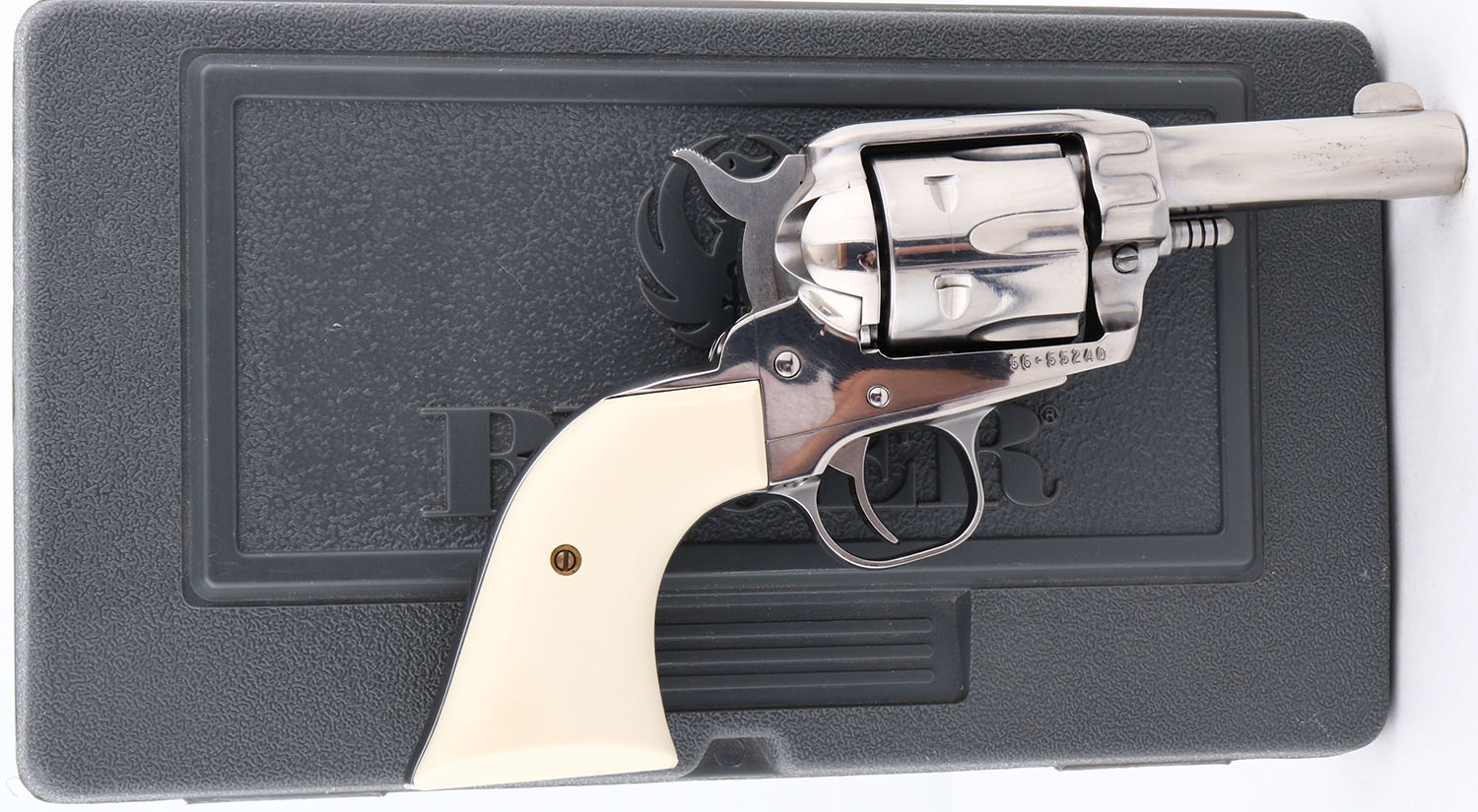 Ruger, Vaquero, CAL: 357 MAG, MFG: 1997, SN: 56-55240, Single Action Revolver, 3 1/2'' barrel. The faux ivory grips are excellent. The stainless steel finish is excellent, with numerous thin brush lines & some minor scuffs. Bore is excellent, with roughness amongst strong rifling. Barrel holds single front blade. Comes in a Ruger grey hard case, with no label. FFL Req. - Value: 500 to 1000