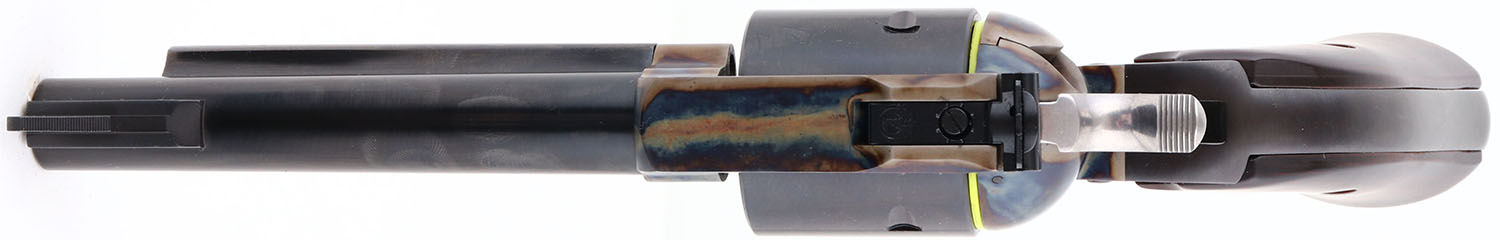 NEW, CASED, Ruger, New Model Blackhawk, Turnbull Bisley Blackhawk, One of 500, CAL: 45LC, MFG: 2017, SN: TBB-00114, Single Action Revolver, 5 1/2'' barrel. The wood grips are excellent. The metal blue finish on the barrel, cylinder & trigger guard rates 98% overall, scuffs on the cylinder. The frame is case-hardened, retaining full case-colors. Turnbull logo on bottom of frame head of trigger guard. Bore is excellent. Factory sights. Comes in original red hard case, with packaging, owners manual, lock & key. NOS. FFL Req. - Value: 800 to 1400