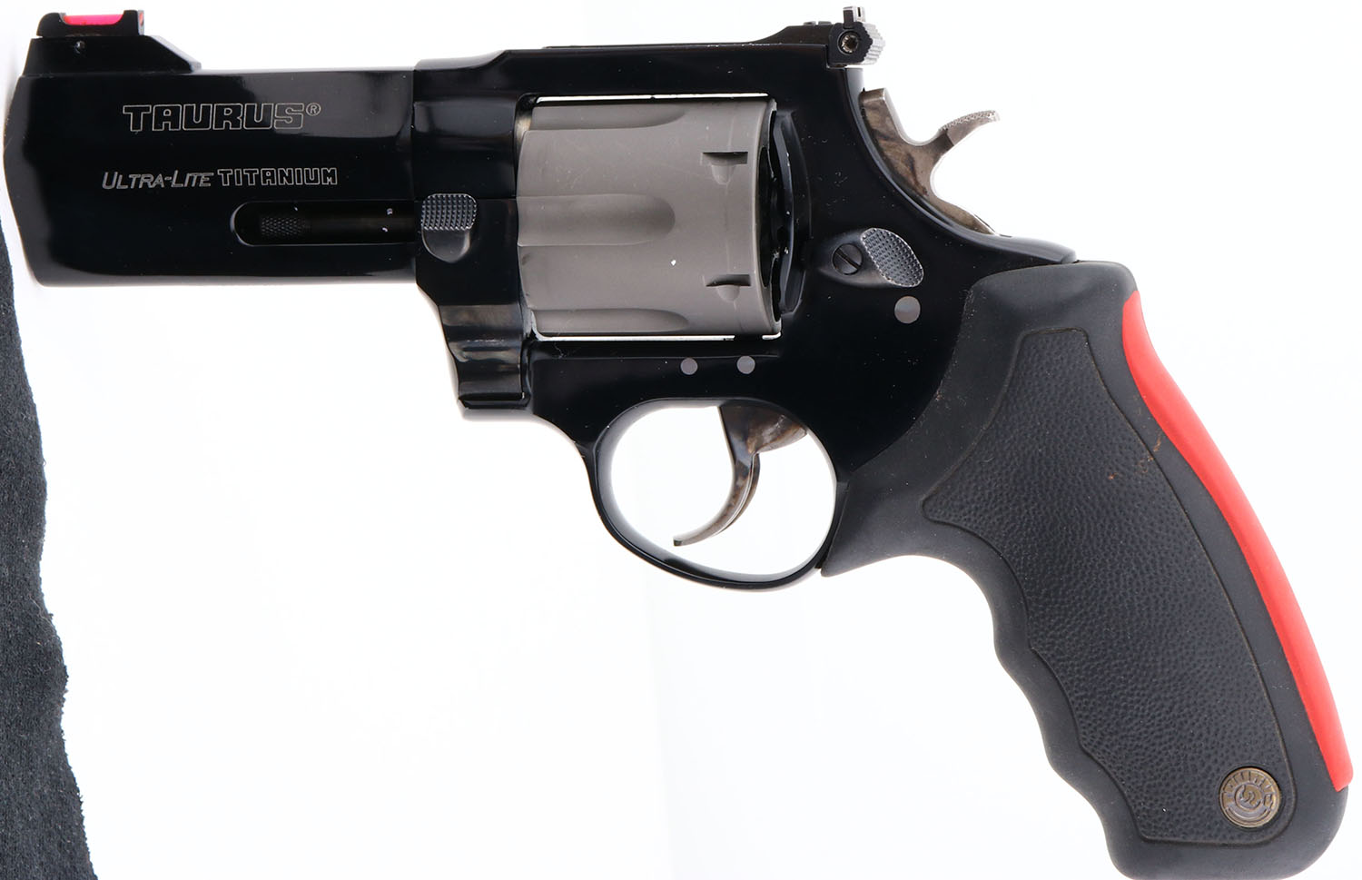 Taurus, Raging Bull Ultra-Lite 444, CAL: 44 MAG, MFG: Modern, SN: EP393526, Double Action Revolver, 4'' barrel. The original, Taurus logo medallion two tone rubber grips are excellent. The Titanium blued finish rates 99% overall. The satin silver finish on the cylinder is excellent, with a faint drag line. Bore is excellent. The frame holds an adjustable rear sight & ramp elevated red fiber optic front sight. This super light, six round Multi-Alloy revolver is the perfect body guard for those hunts that are a little extra hairy. At just 28 ounces you wont even notice it's there until you need it. FFL Req. - Value: 500 to 1000
