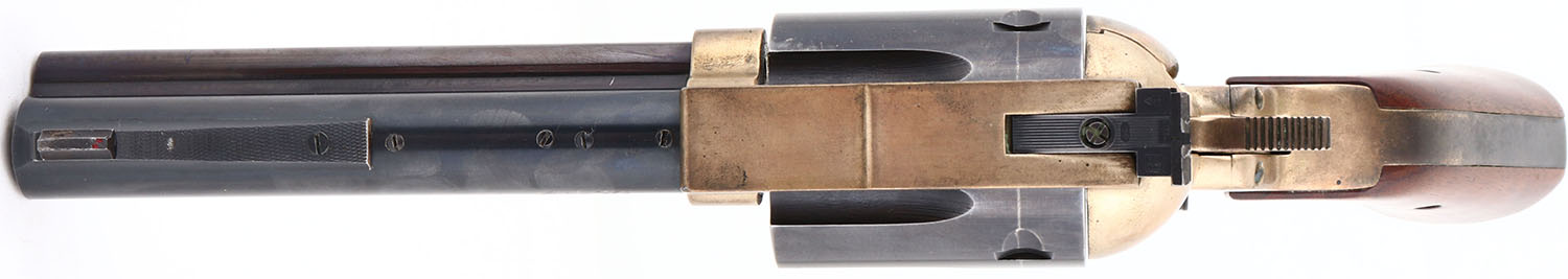 Century Mfg Inc, Model 100, CAL: 45-70, MFG: 1970's-80's, SN: 968, Single Action Revolver, 6 1/2'' barrel. The wood grips are excellent. There are minor scrapes to the finish. The metal blue finish on the barrel & cylinder rates 95%, with scuffs & a drag line on the cylinder. The ejector rod housing has toned to a plum patina. The brass frame is excellent, with a thin haze. Bore is excellent & minty. The frame holds an adjustable rear sight & a ramp elevated blade front sight. FFL Req. - Value: 1000 to 2500