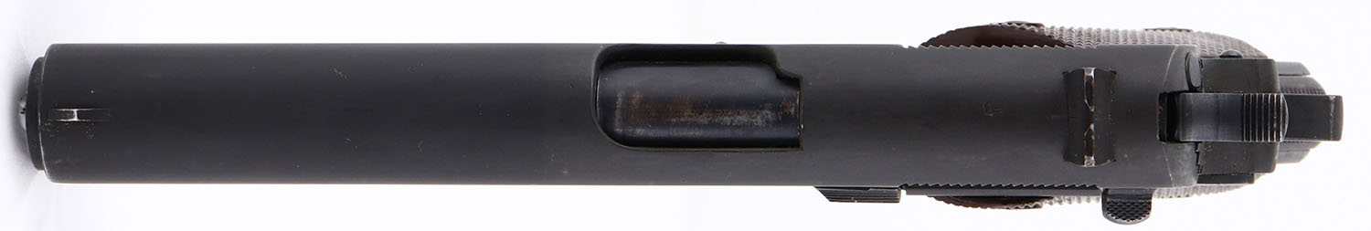 Ithaca, Model 1911 U.S. Army A1, .45 ACP Cal., Semi-Auto Pistol, Mfg. 1944, SN: 1887103, 5'' barrel. ''ITHACA GUN CO., INC. ITHACA N.Y.'' stamped on rear of left side of slide. ''UNITED STATES PROPERTY'', ''M1911 A1 U.S. ARMY'' & ''No. 1887103'' are all stamped on right side of frame. ''P'' stamp on the top of frame. ''FJA'' (Frank J. Atwood) Inspector Stamped behind trigger on left side. Lt Col Atwood was the US Army Executive Officer in charge of all ordnance activities in his district. Lt Col Atwood was assigned to the Rochester Ordnance District & had sole responsibility for inspecting & accepting or rejecting all war material that was produced or manufactured under Government contract in this district from mid-1942 through early 1946. During this time frame in the Rochester district both the Remington-Rand & Ithaca factories fell under his control. Consequently if you look at any model of M1911A1 produced by either of those companies, you will see his initials ''F.J.A.'' prominently stamped on the left side of the pistol frames. The military metal finish rates at 95%. The checkered hard plastic grips are excellent, with very tiny dings. Exterior of barrel is blued. Bore is excellent, Fitted with the standard lower profile fixed sights. Unmarked magazine has odd blue film on bottom. Lanyard staple on bottom strap. As Most of these guns were re-arsenal all parts may not be original to pistol. Serrated backstrap. Backstrap squeeze safety. A very nice US Property, Army stamped WWII example. FFL or C&R Req. - Value: 2000 to 3500