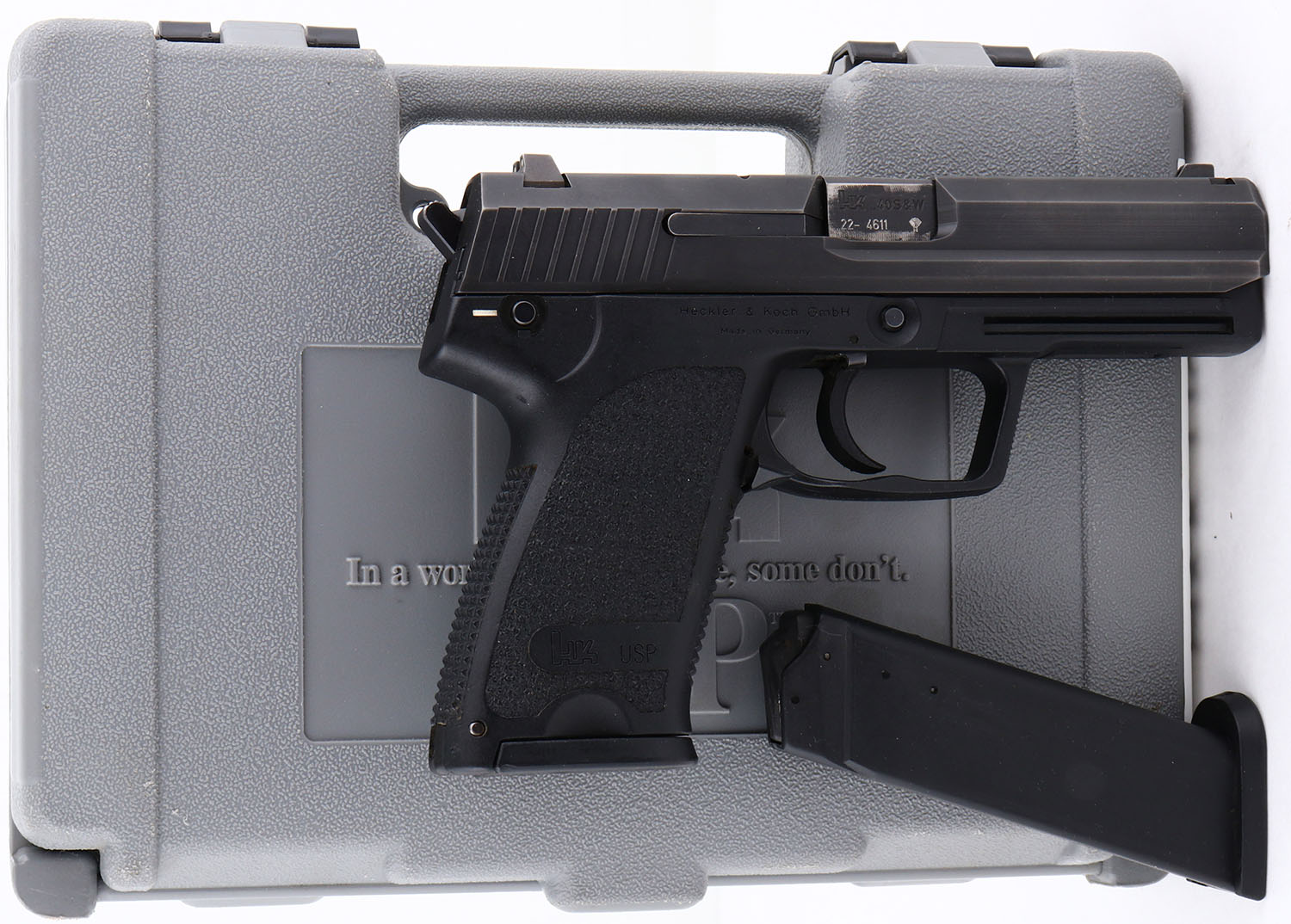 CASED Heckler & Koch, Model USP, CAL:40 S&W, MFG: Modern, SN: 22-4611, Semi-Auto Pistol, 4'' barrel. The polymer frame & grips are mint. The factory black metal finish on slide rates 98%. Bore is excellent. Universal mounting groves for mounting accessories. Ambidextrous mag release lever. Oversized trigger guard for use with gloves. Original sights. Comes in the original factory case, with additional factory 13 rd mag. FFL Req. - Value: 800 to 1200